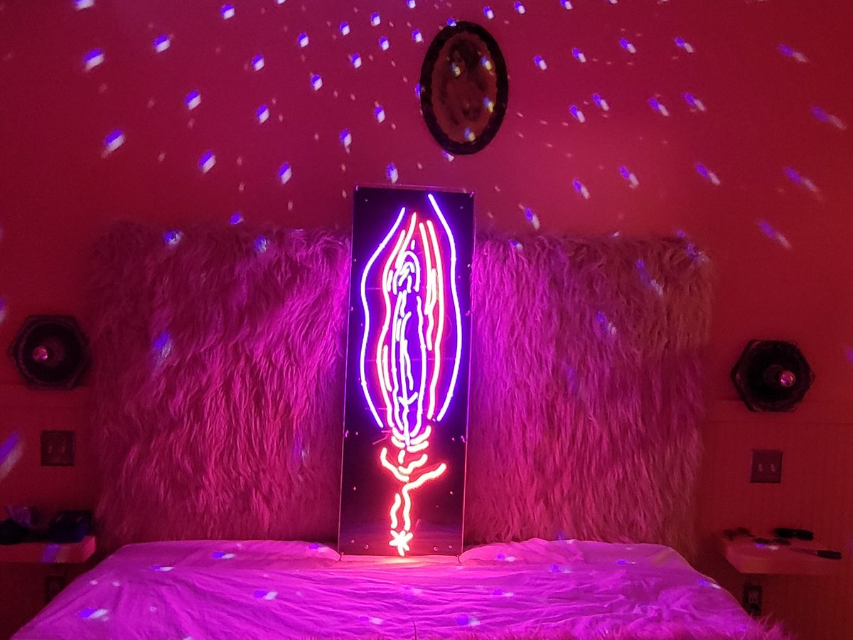 I recently had my self-portrait made into an actual four-foot-tall glowing neon pussy, and traveled across the United States with it. Taking on my own personal shame by showing my vulva to as many people as possible. My pussy has now been seen in places like Washington Square Park in New York, the National Mall in Washington DC, The Grand Canyon, and will be exhibited at the Seattle Erotic Arts Festival in October 2021.