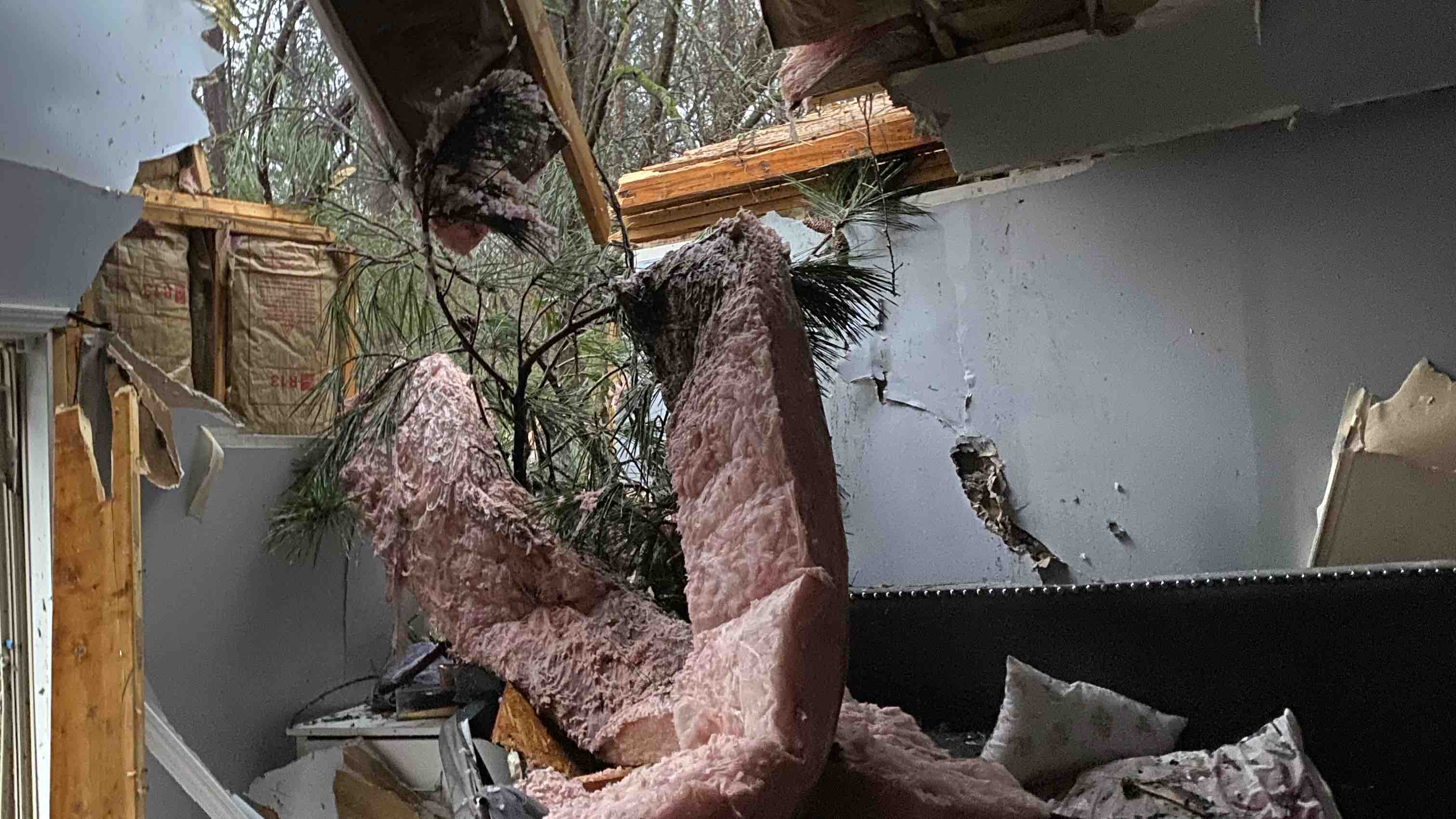 Thankfully just 2 seconds before my son decided to get up and go tell my cousin that the lights were flickering really bad. Because had my baby not have done that , he would have been on the bed in my room where a over 300ft tree fell right through my house It hit us so bad , causing SO much damage to the house. A total of 6 over 300ft trees from the woods have fallen on our house , causing our roof and walls to cave in , a tremendous flood and severe damages to our belongings. Our deck is completely torn off the side of our home , a huge tree is through the roof of my bedroom & there is a tree through my kitchen dining room. There is water , glass and damages everywhere. Though I am terrible sadden by this unfortunate event , I am very blessed that we are all alive. Things like this only happen in movies , at least so I thought.