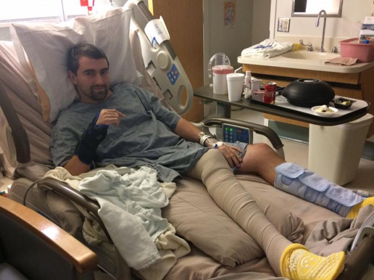 He fractured both femurs. Distal one side, upper femur and shattered ball joint on the other side hip, dislocated one knee (right) and split patella on the other (Left), and fractured his right tibia. compound fracture in right forearm, and 6 fractures in right wrist. He has already undergone one very extensive surgery resulting in a lot of internal and external hardware, and will undergo a second surgery later this week.
