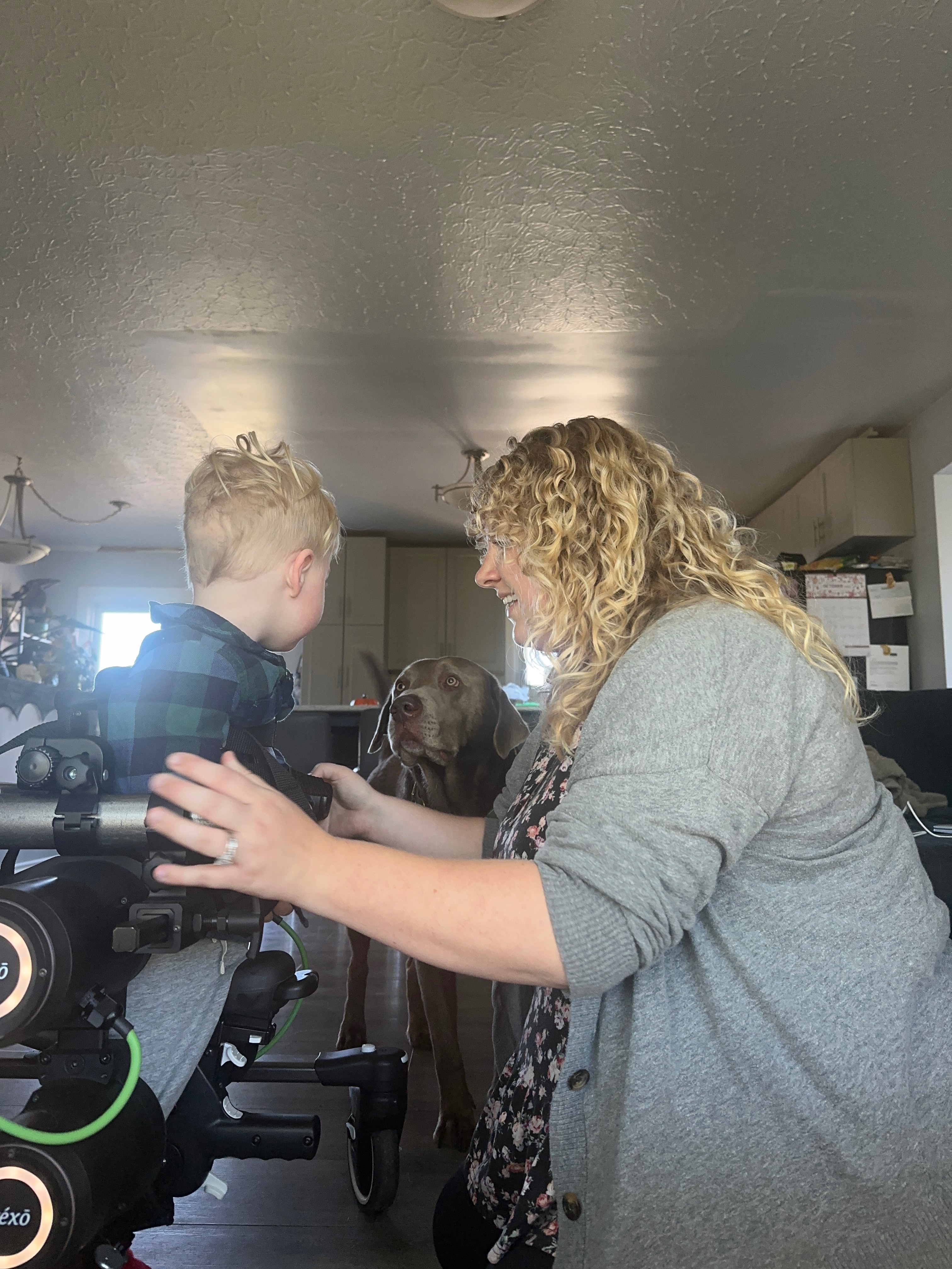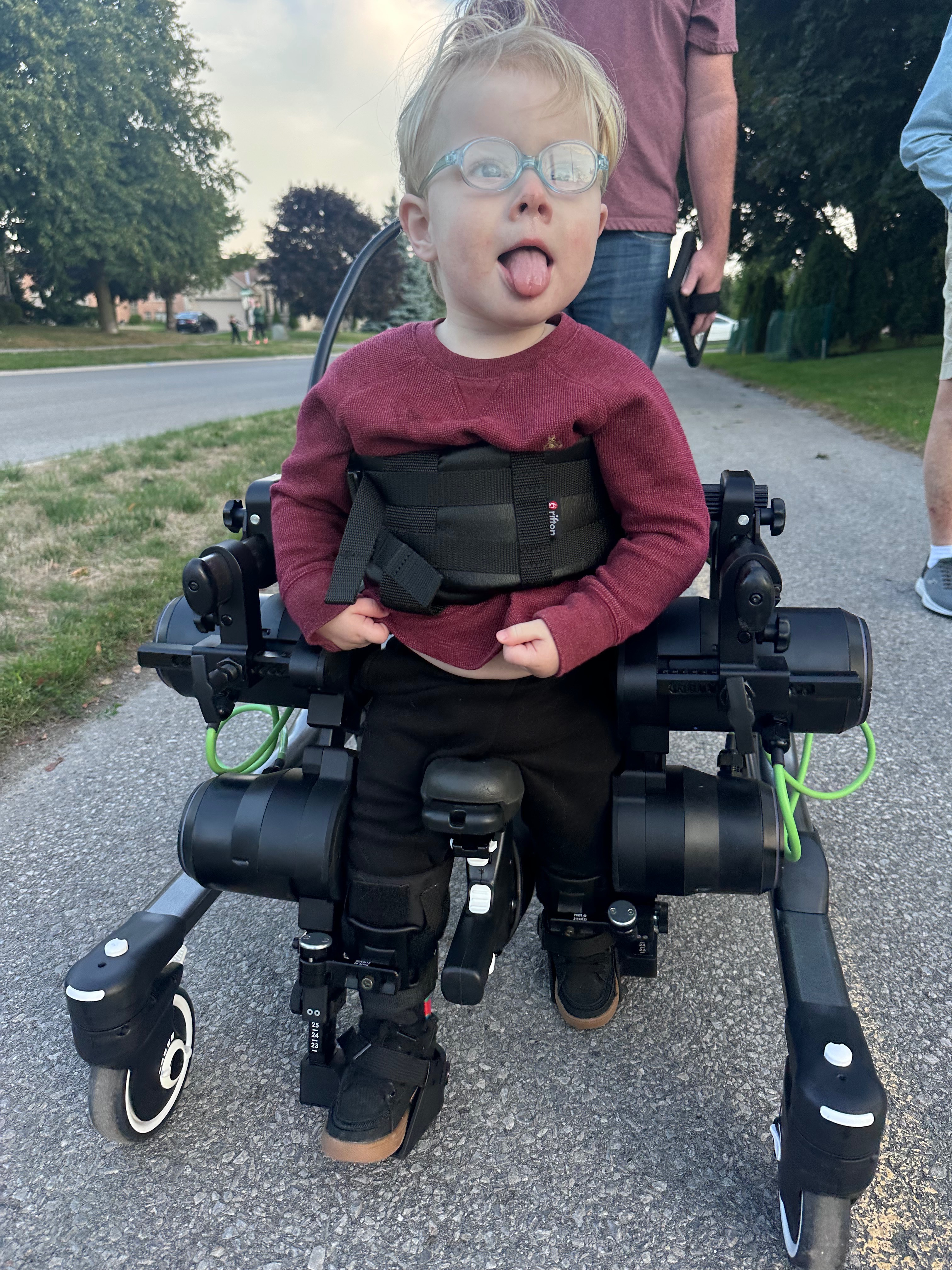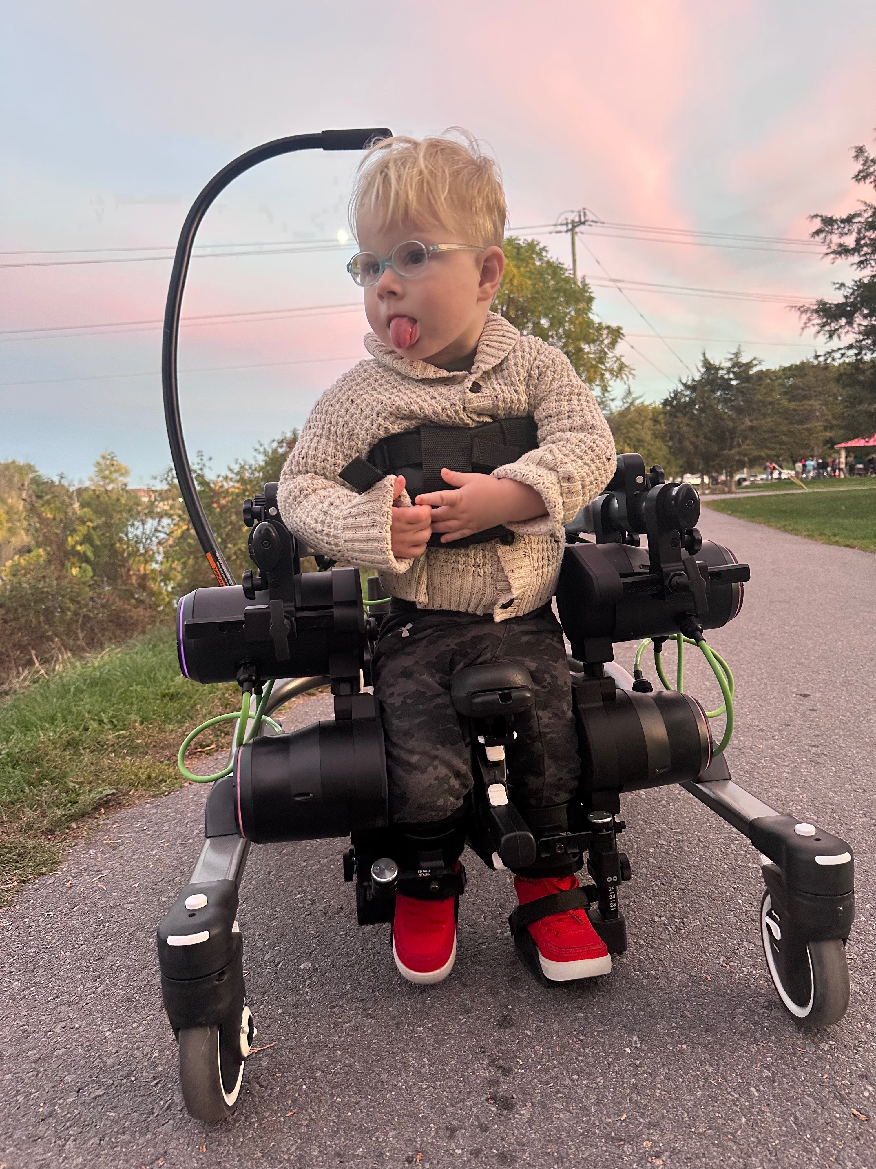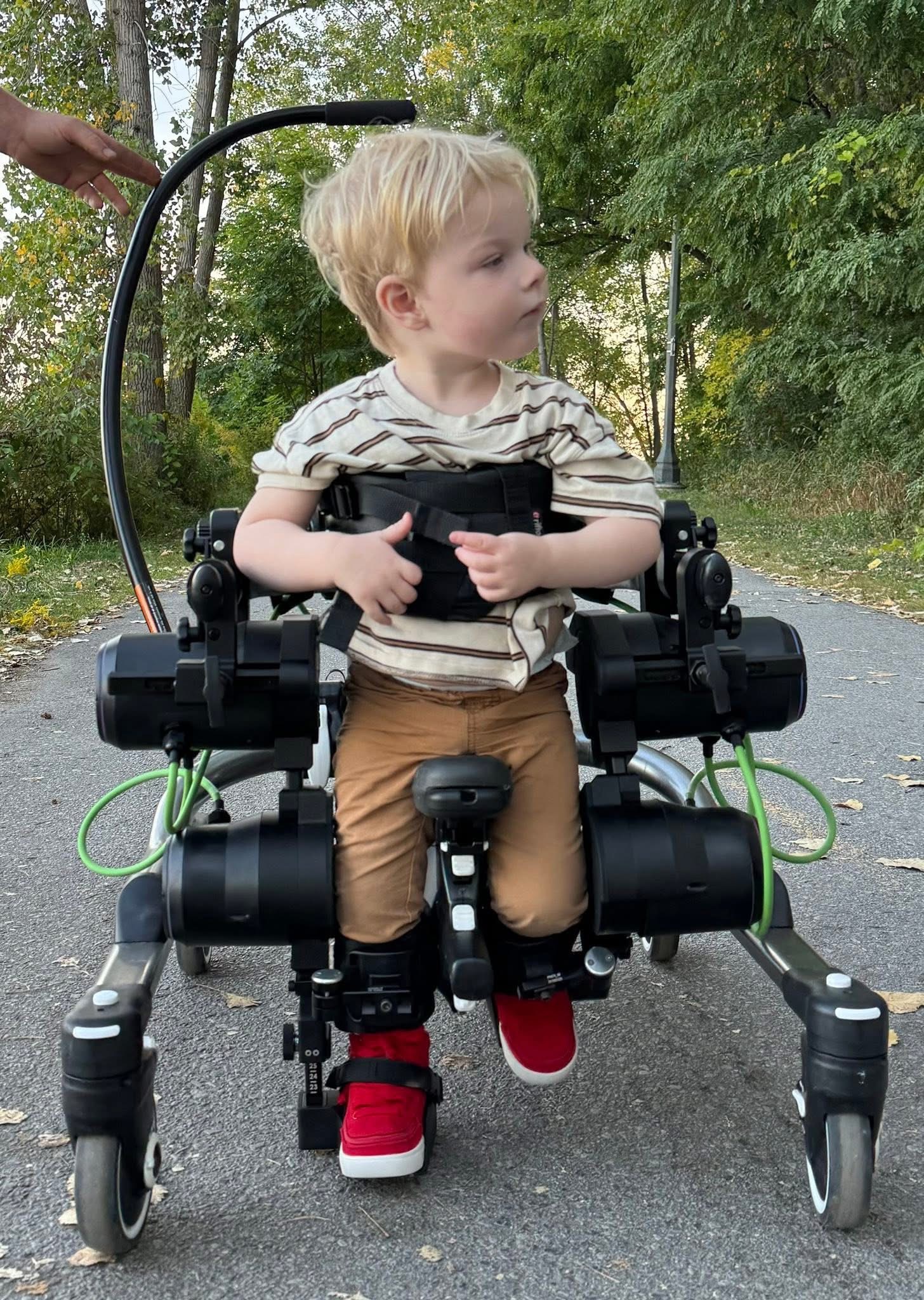 Despite everything he’s up against, Colby’s spirit shines so brightly. He works so hard in therapy and never gives up. Earlier this year, we were one of the lucky families chosen to try the Trexo Robotics walker for one month — and it was absolutely life-changing. For the first time, Colby was able to take independent steps, explore the world upright, and experience a freedom we never thought possible.