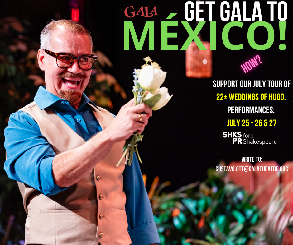 GALA Hispanic Theater has been invited to give four performances at the end of July at the Shakespeare Forum in Mexico City of its acclaimed production of Gustavo Ott's "Las 22+ Weddings of Hugo." The team traveling to Mexico City includes, in addition to four actors, two technicians, and the author.