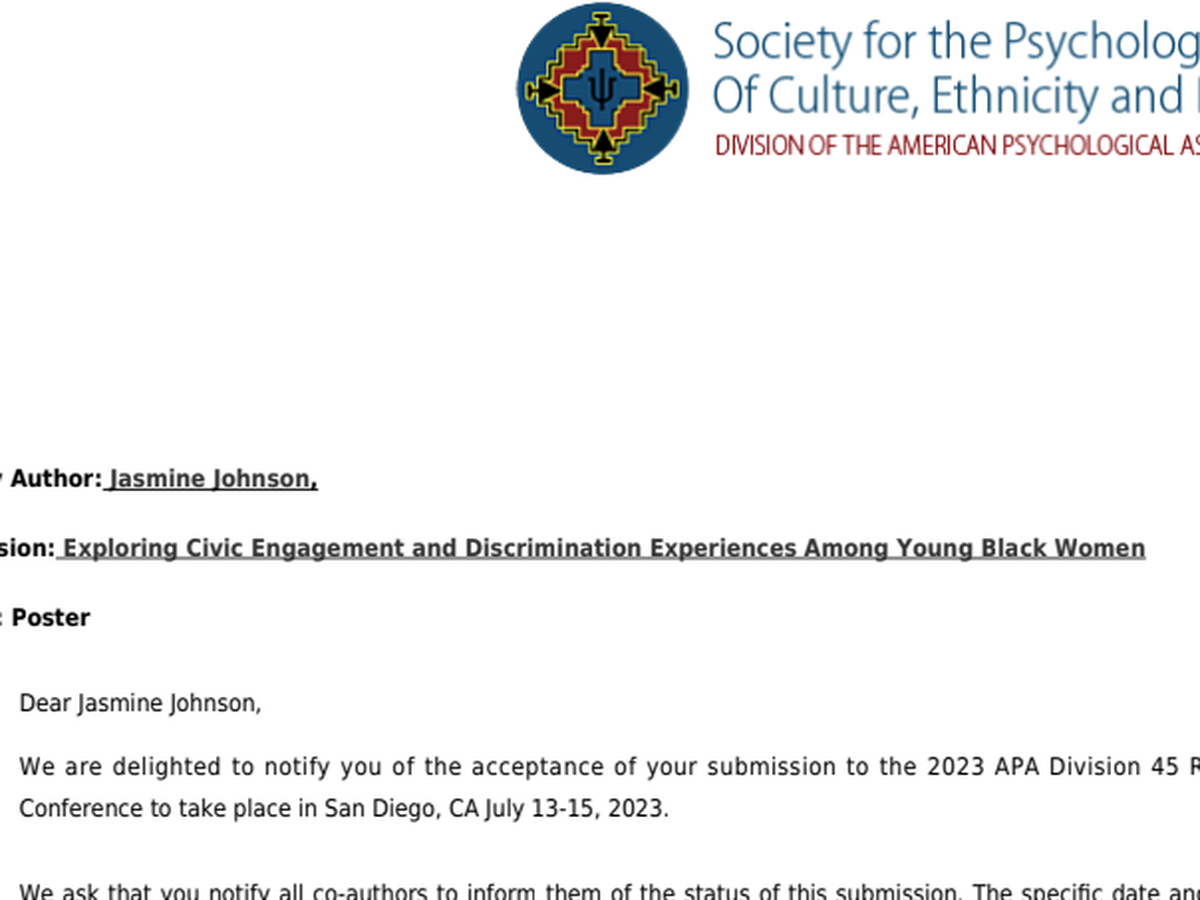 My name is Jazz! I am a third-year doctoral student studying Applied Developmental Psychology. I am also the first in my family to pursue graduate education. I recently was accepted to the American Psychological Association Division 45 Society for the Psychological Study of Culture, Ethnicity, and Race Research conference in San Diego to present my thesis as a poster. My thesis is titled Exploring Civic Engagement and Discrimination Experiences Among Young Black Women. Despite being given this amazing opportunity to share my work and network with colleagues and prominent researchers, there are some financial obligations that I need help with. I have to pay for registration fees, flight, hotel, transportation, and food. The conference is July 13-15, 2023.
