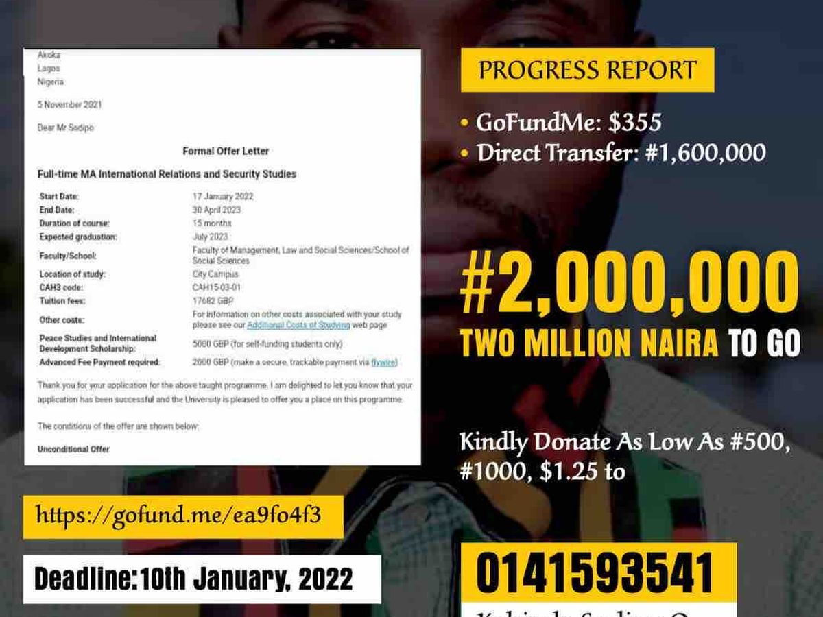 I have been to pay my deposit fee of £2000(1.615,000M) but I still need 2 Million naira more covering for my Visa, Health Surcharge, Accommodation and other Living Expenses to achieve this goal.
