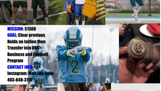 Hi, My name is Beko Wande, and I am a first-generation immigrant that moved here at a young age. I grew up in Alberta, where I developed my passion and talent in Football; from there, I was recruited to multiple universities to play and continue my education. Unfortunately, due to Covid, my plans where I intended to play had been shifted, and I was in motion for a new beginning. Within the last year, I had traveled from the Univerity of Calgary to play junior football for the Langley rams and won the National Championship. From there, I was then recruited by numerous colleges again. I chose to attend Carleton Univerity in Ottawa this previous semester(January-April), and that's where I began to go through a series of unfortunate circumstances that left me with the decision to transfer to the University of British Columbia on such short notice. Once May came, I flew back home to Alberta, where I immediately planned and moved to Vancouver to catch up on what the team had been doing and get myself situated on the west coast. All my courses are ready to be transferred, but the financial process has put me in a bind. I have been working to pay off my previous semester at Carleton university so I can receive my transcript to then forward to UBC so I can continue to pursue my goals, receive my degree and professional football. I have been working all summer, and all of my money has been put towards repaying the tuition. With the season's urgency around the corner, I am looking for some support to get everything finalized in time to make me eligible for the upcoming season.