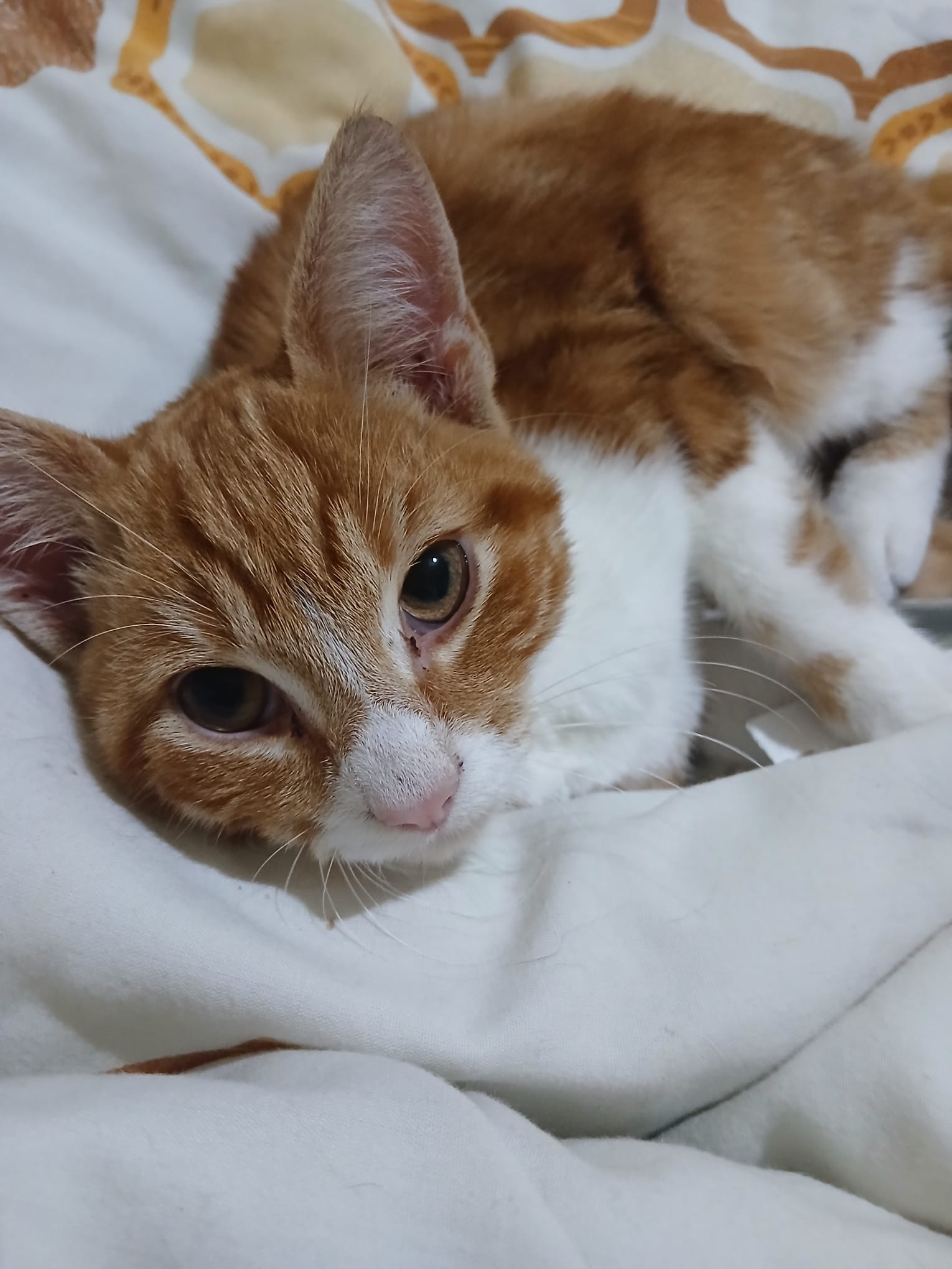 Ginger suddenly turned up one day in my back garden, underweight and weak. We decided to let him in sometimes because the weather was bad but we continously fed him outside. He decided to stick around and would sleep in the tree outside our home. Due to his size (small kitten), all the other cats would bully and attack him. As a cat lover, this hurt so I managed to persuade my mom to let him have sleepovers in her bedroom instead of sleeping in the tree. The next day, he ran into our home for his sleepover, he was cuddling me usual. I put him down on my mother's bed while I went to get everything ready for him. Suddenly, he couldn't stand, he was swaying side to side, had heavy breathing, eyes leaked green discharge, felt weak and fragile, struggled to generate heat, had watery eyes and a bit of a runny nose. He couldn't jump down off the bed to use his litter too so he ended up accidentally urinating on himself. He left his food. All he would do since then was lay down and do nothing but suffer. I didn't think he was going to make it last night so I stayed up with him. Today, I took Ginger to feed him a little bit of milk and he downed it. While I was putting out his food, he was walking around slowly as If testing his legs again. I like to think that I have very slowly nursed him back to health but not completely. He needs to go to the vets urgently because he's still suffering. I frequently look at him and his eyes are usually watery or his mouth is dry.