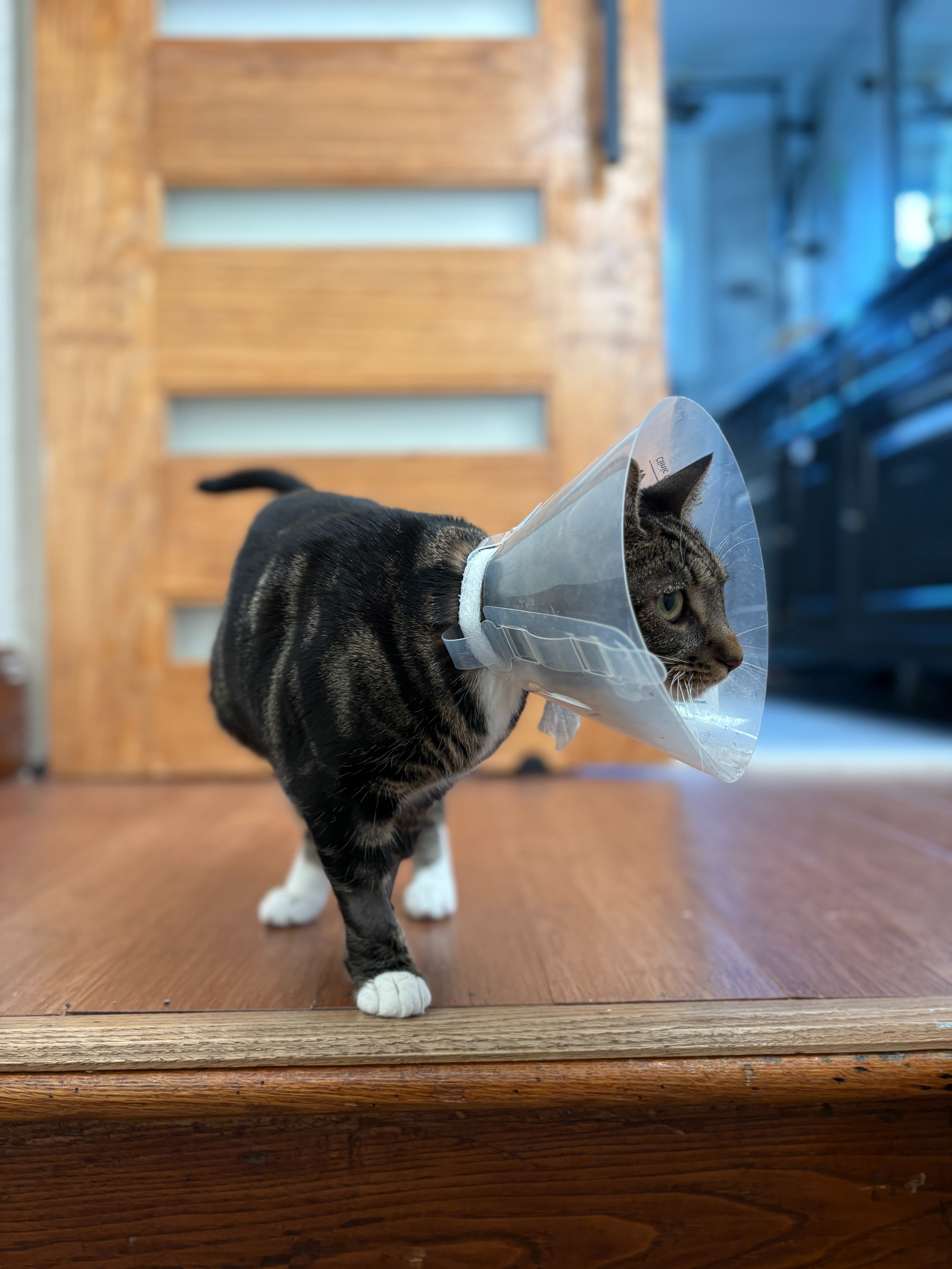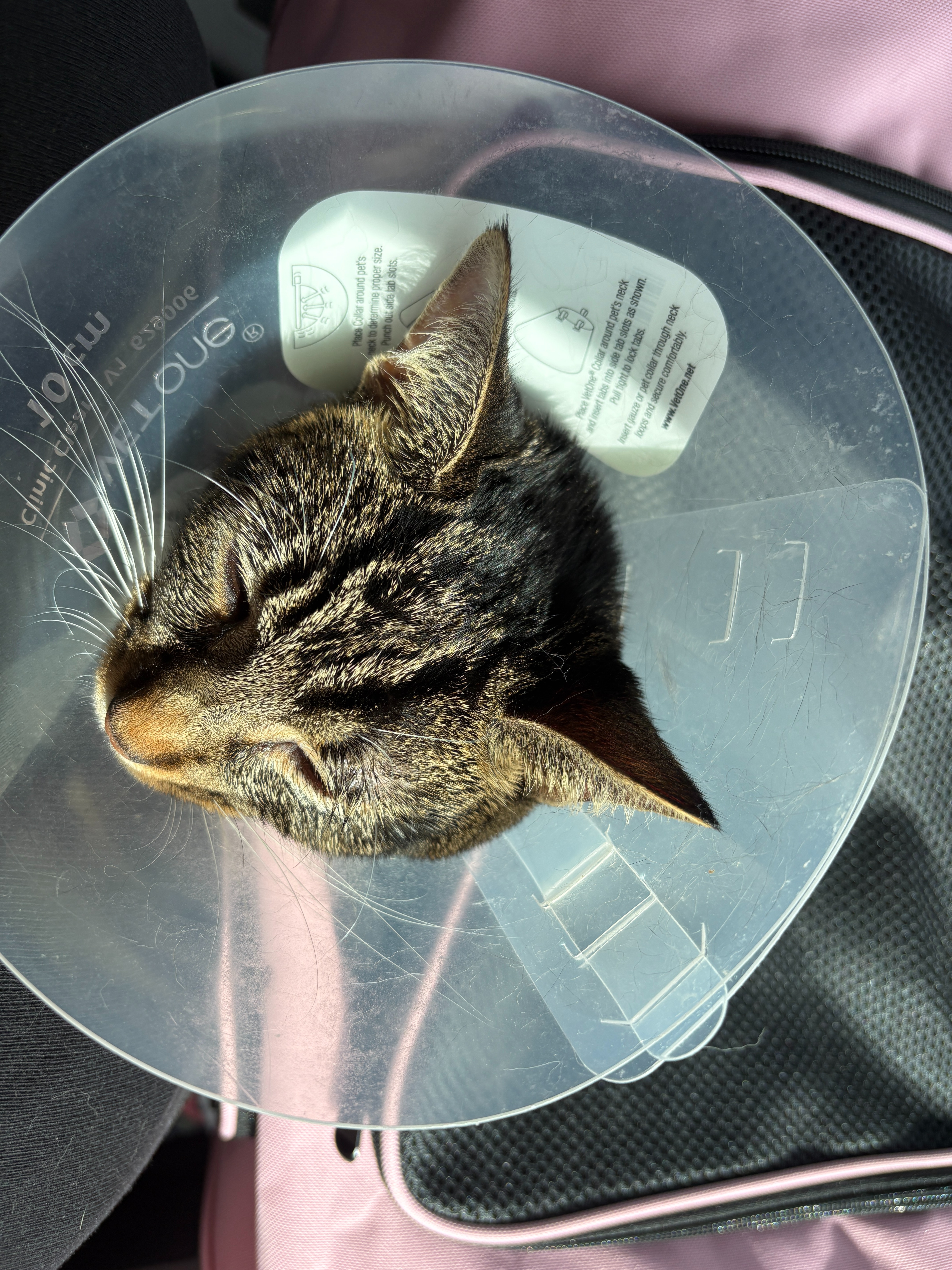 The doctors had to do surgery—three cuts in my little tummy!—and now I’m rocking a cone like it’s high fashion. Don’t worry, I’ll be okay. I may even sparkle for a few more days, if you know what I mean.