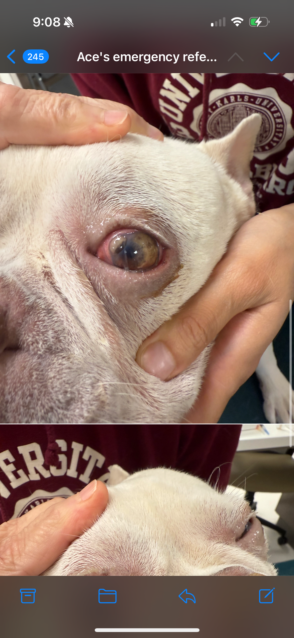On Sunday, June 1, 2025, Ace started having issues opening his eyes, and we couldn’t figure out why. So we got in contact with his vet to pick up over-the-counter ointments and medication. On Tuesday, June 3, 2025, we had to rush Ace to VCA because he was crying in pain with discharge around his eyes and couldn’t open them. We then rushed him to San Antonio Veterinary Specialist to see an ophthalmologist and was then admitted into emergency surgery due to an ulcer around his cornea.