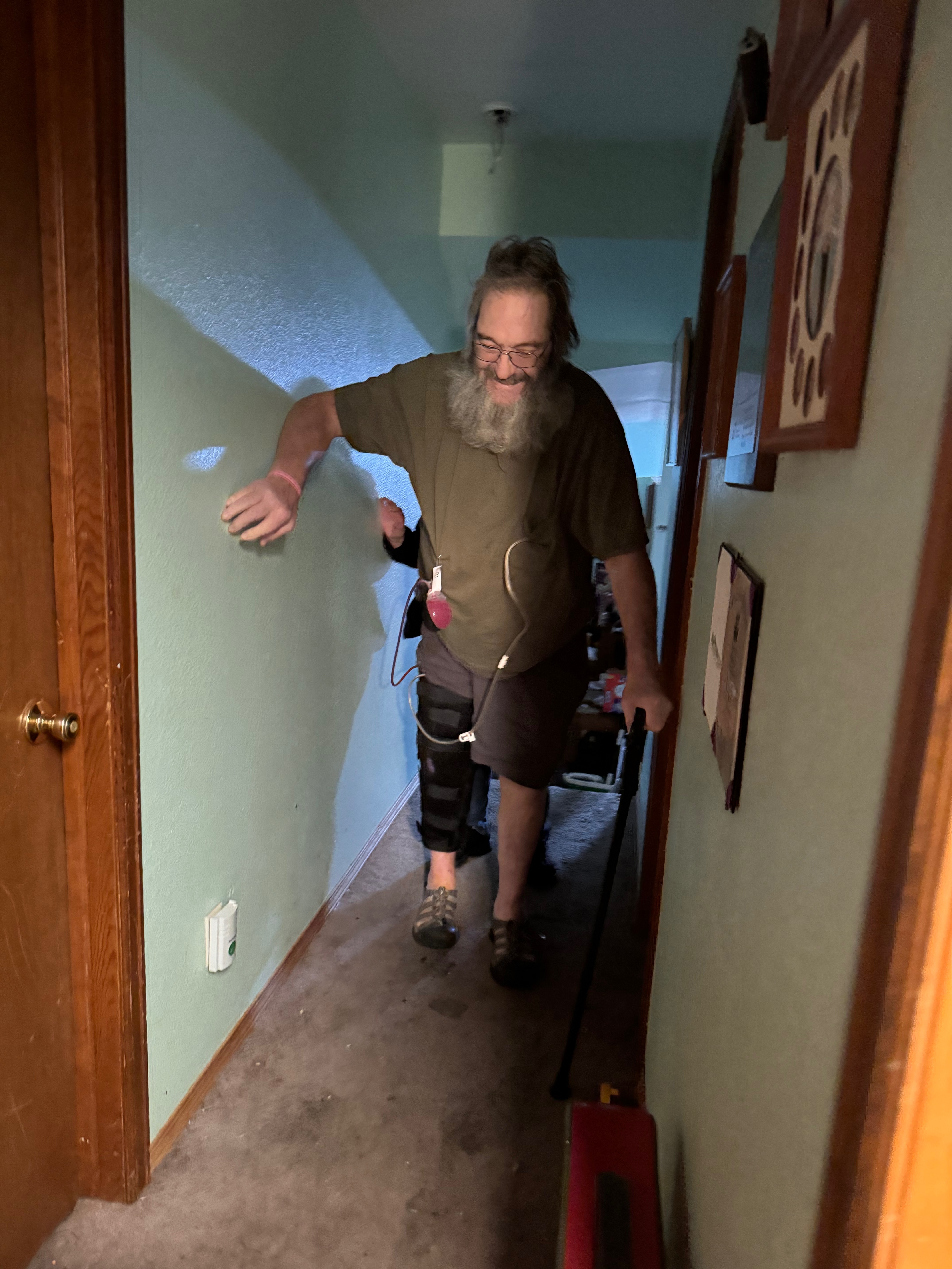 He developed an aggressive infection shortly after, and his life became consumed by surgeries and hospital visits. In the last 8 months, he has undergone 14 surgeries trying to clear the infection. Imagine that—14 times on the operating table, 14 times hoping it would be the last, and still the infection kept coming back. For much of this time, he had no knee at all. His leg was fused completely straight—unable to bend. Everyday tasks that most people take for granted became impossible. His independence slipped away piece by piece, and the outdoorsman who once never sat still was forced into a life of waiting, enduring, and hoping.