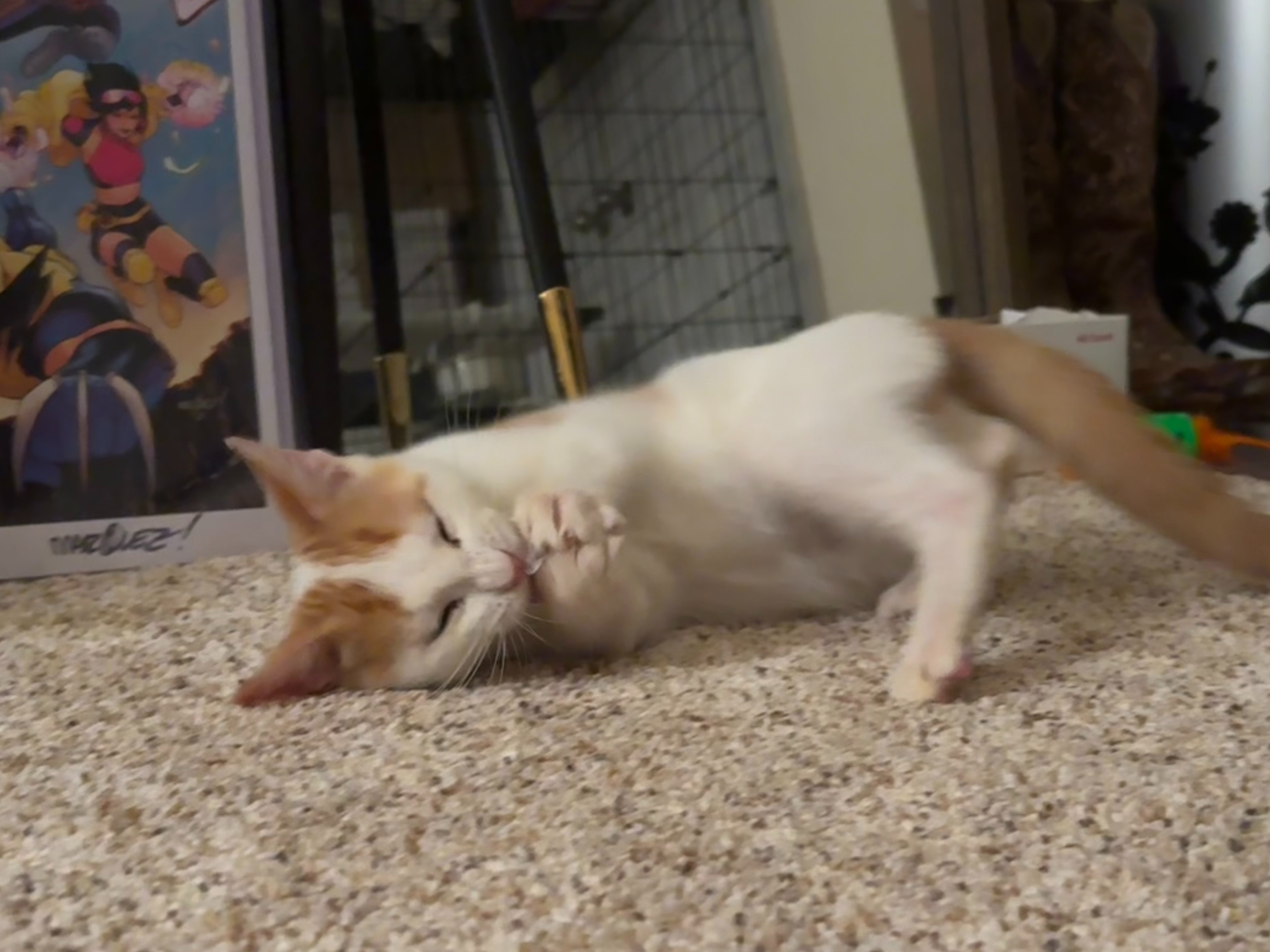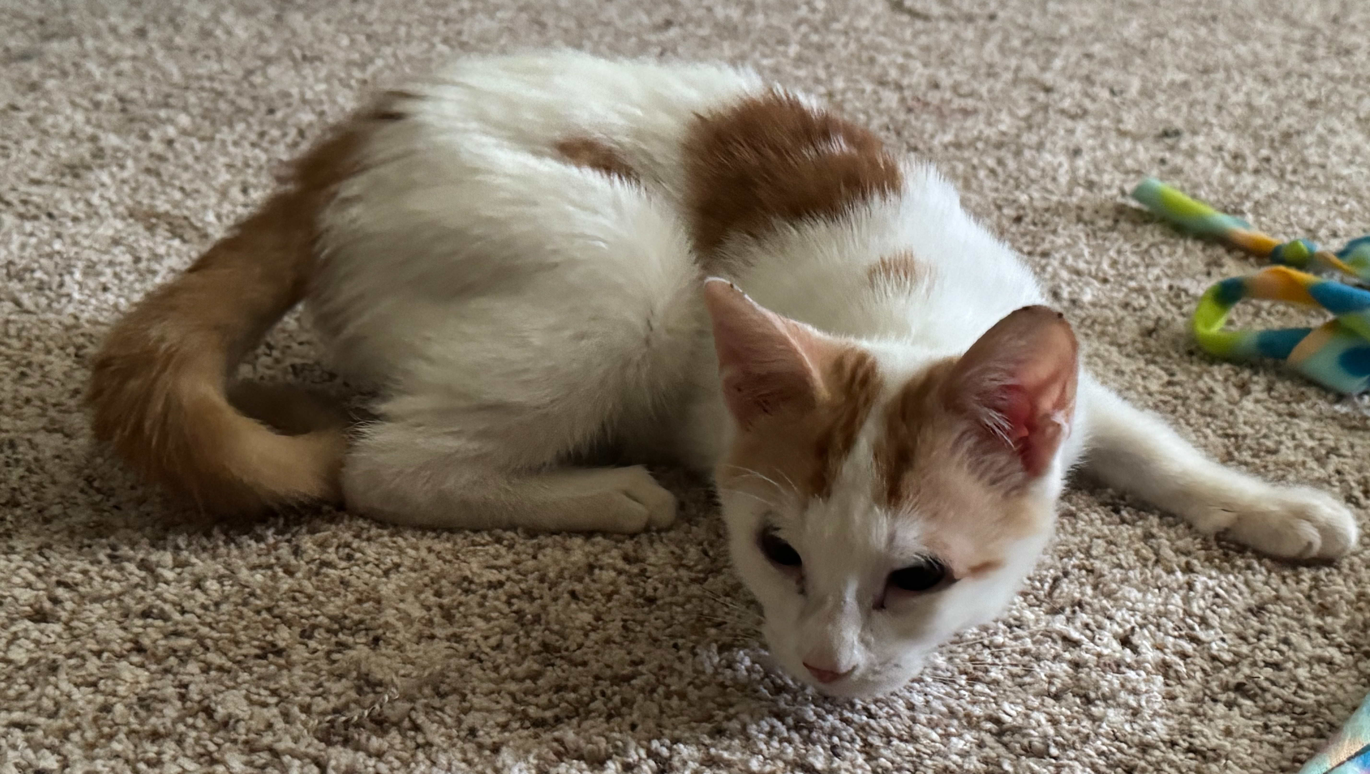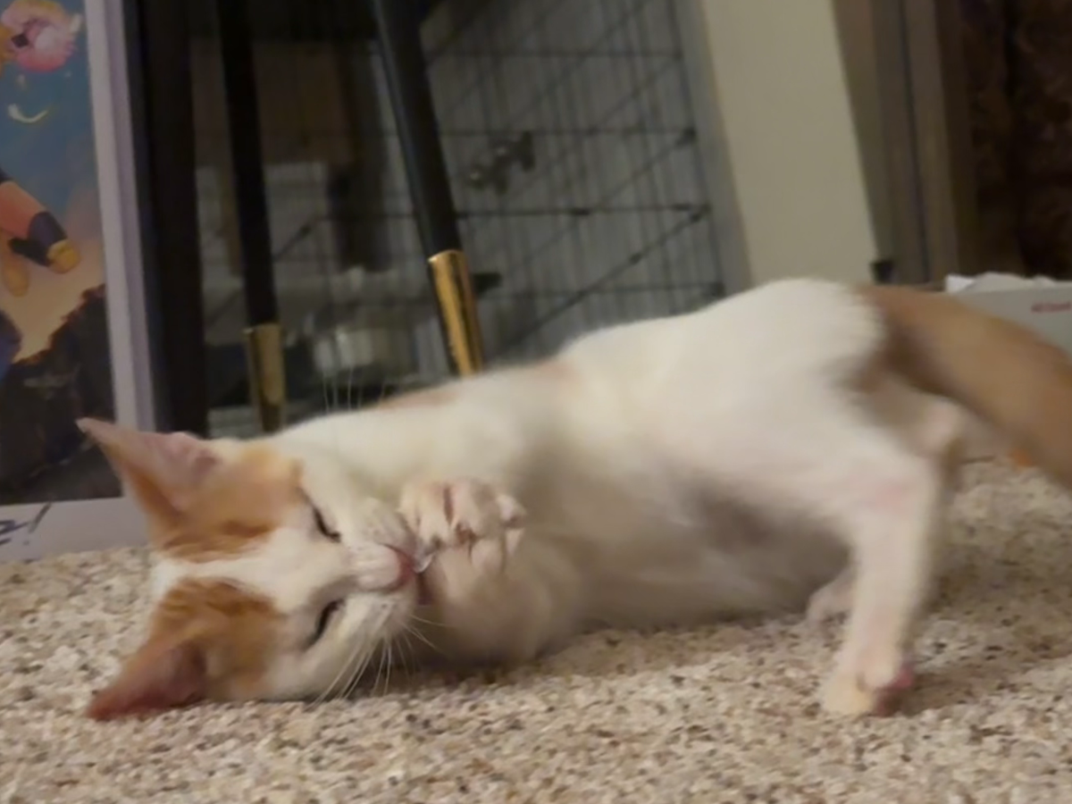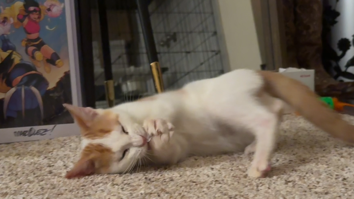 We're not sure where he came from, but he'd been outside on his own for awhile. He had a LOT going on for such a little guy - fleas, conjunctivitis, and apparently ALL the parasites. But he took his treatments like an absolute champ and really came out of his shell, going from shy and spicy to a happy, goofy goober with aspirations of becoming a professional biscuit maker.