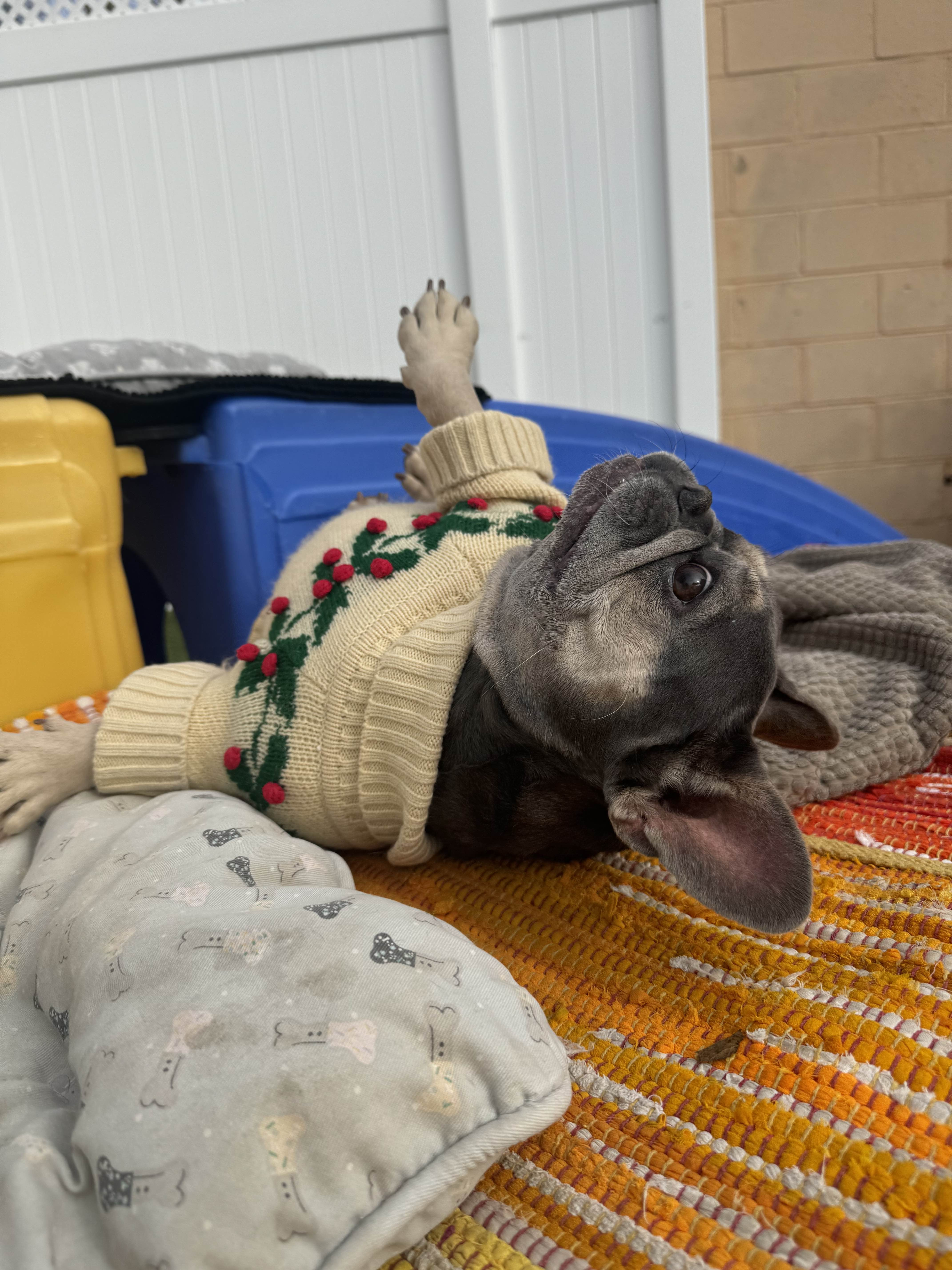 Holly Jolly is a French Bulldog we adopted a little over a year ago from a rescue called Second Chance Boxer. She was used as a breeding dog in an Amish puppy mill and was kept in a cage her entire life until she was saved by Second Chance Boxer Rescue.