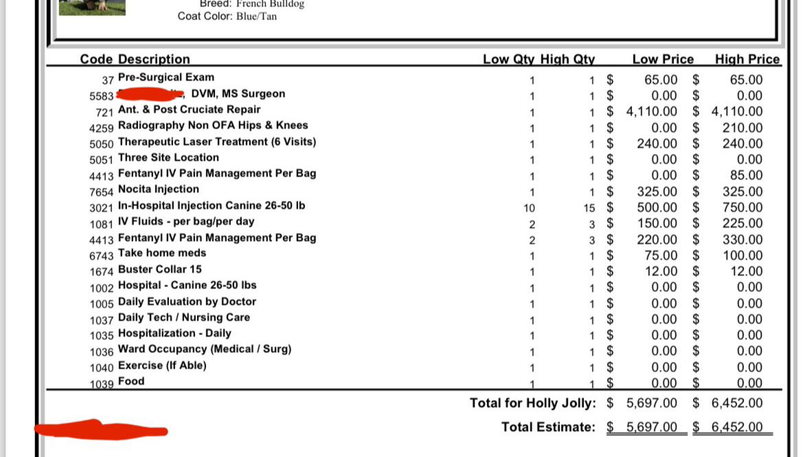 The majority of her surgery cost will cover the specialist vet performing the surgery. The rest will go to her regular vet for all the other charges.