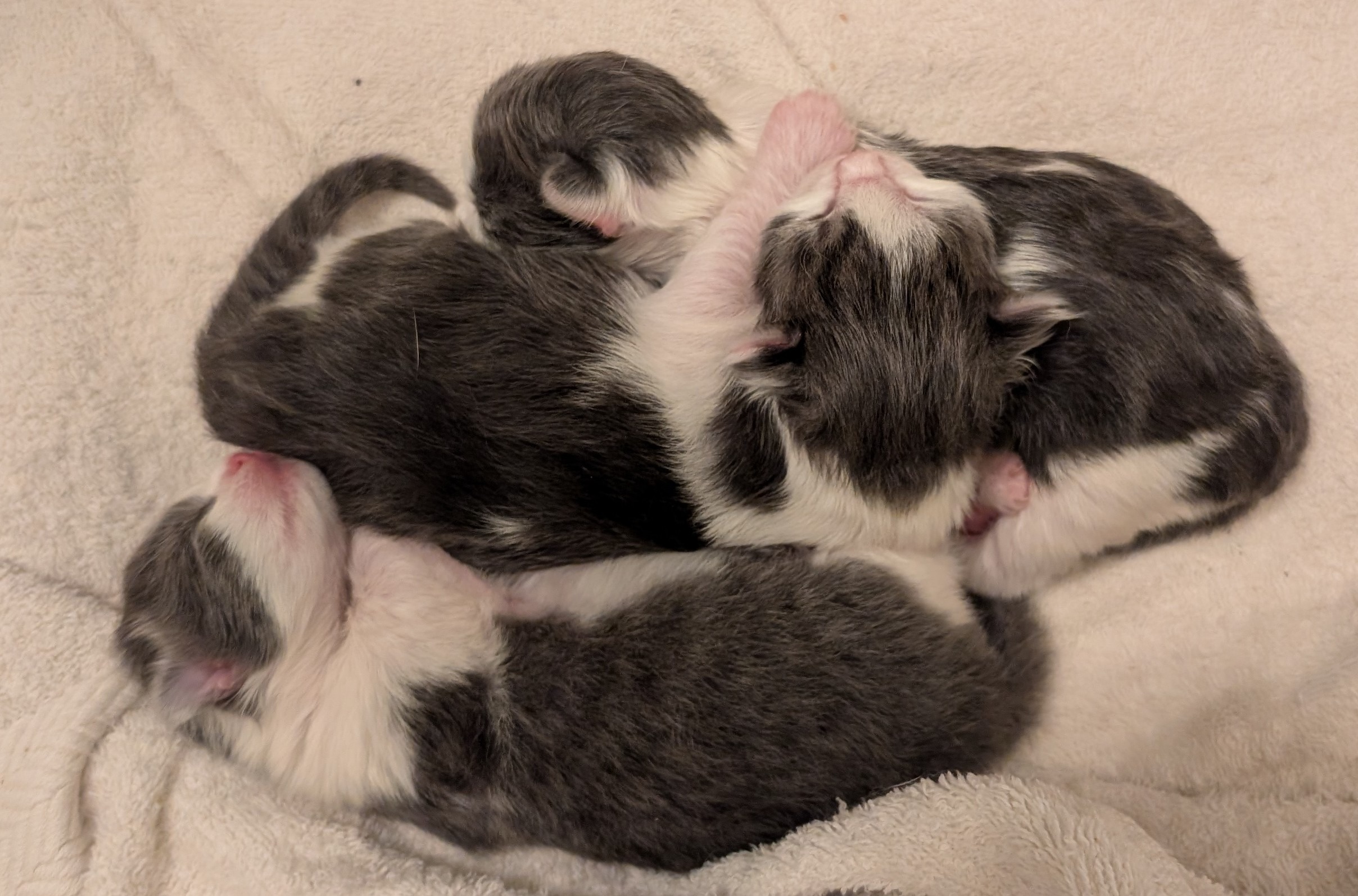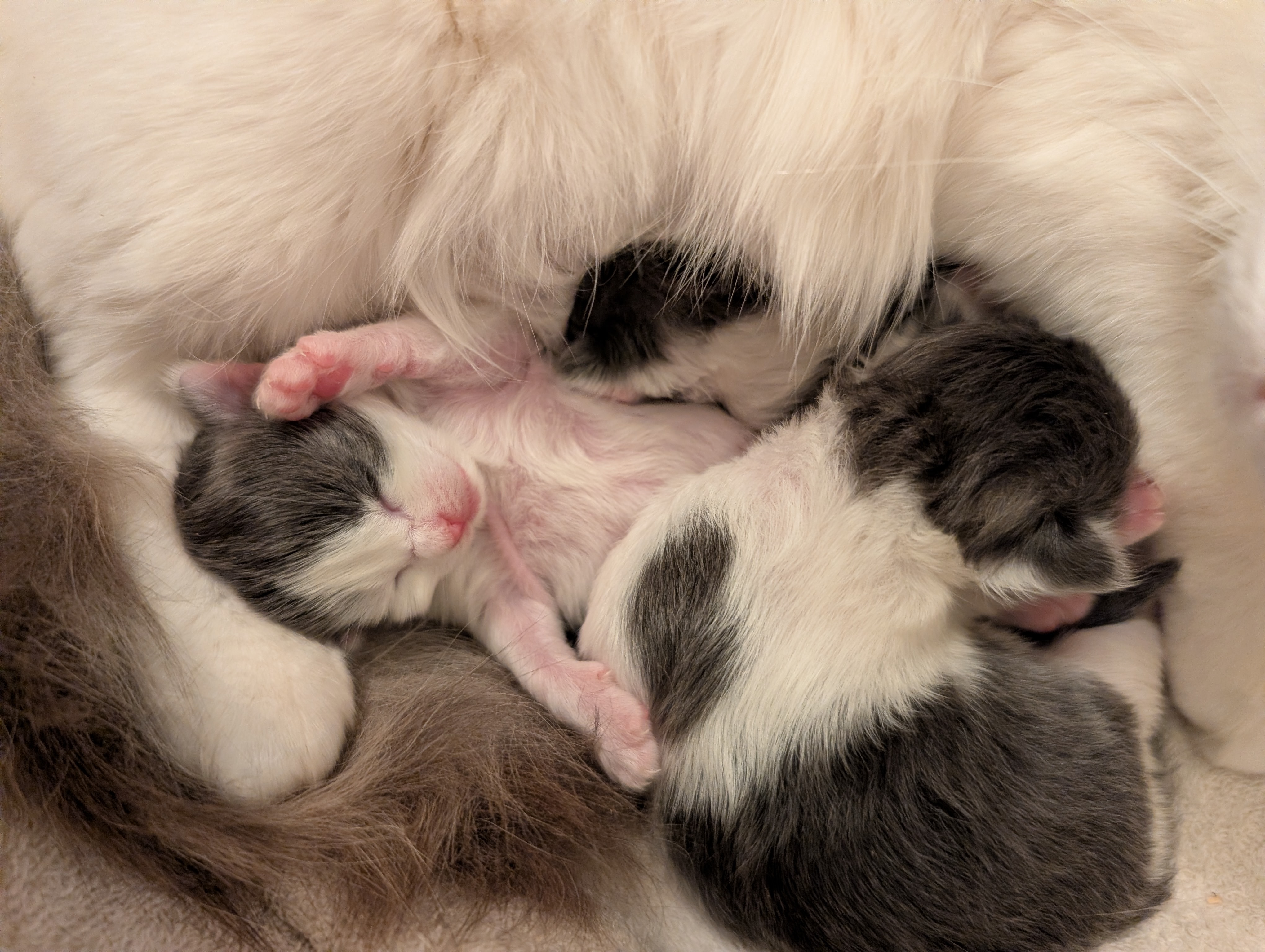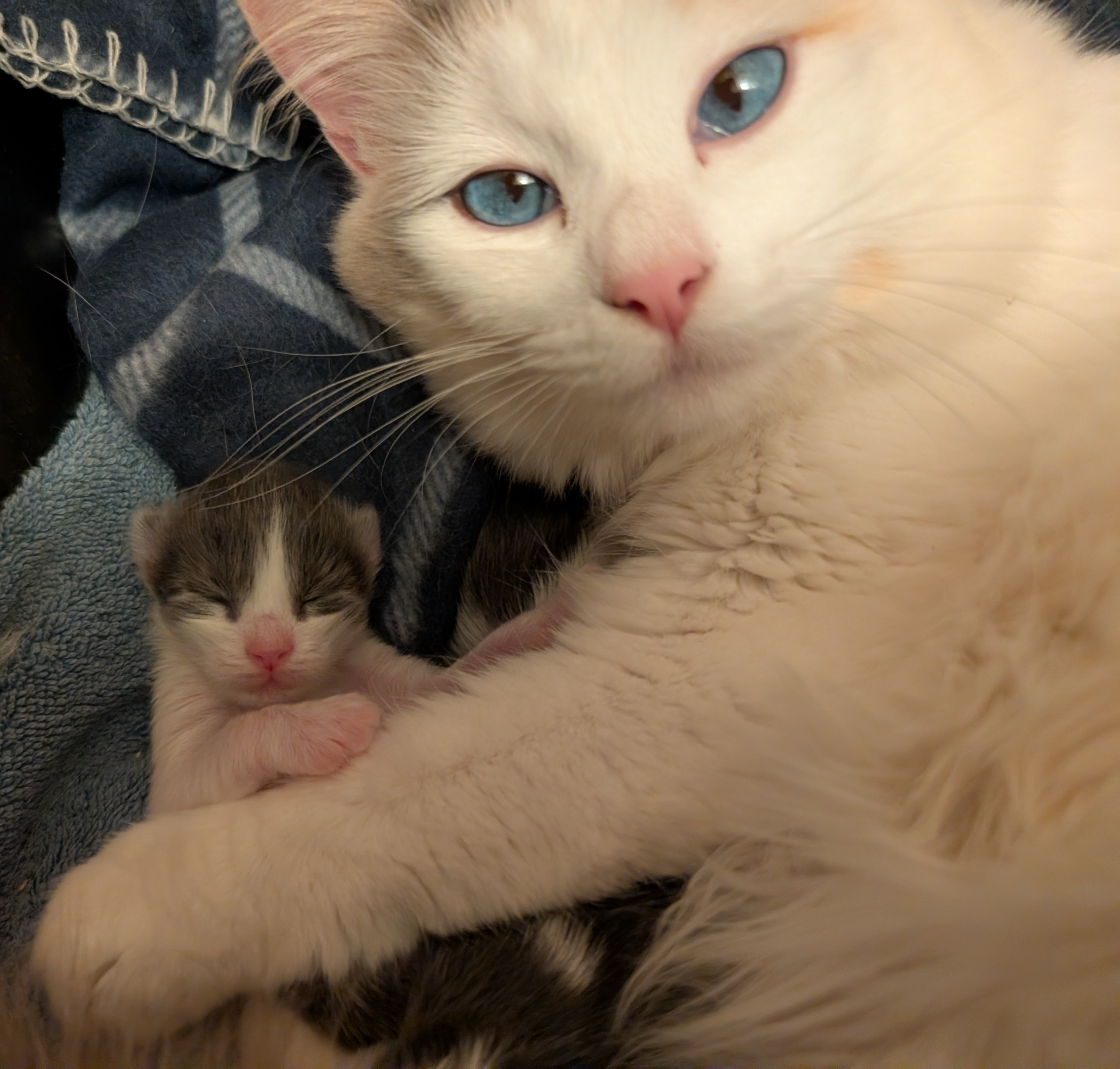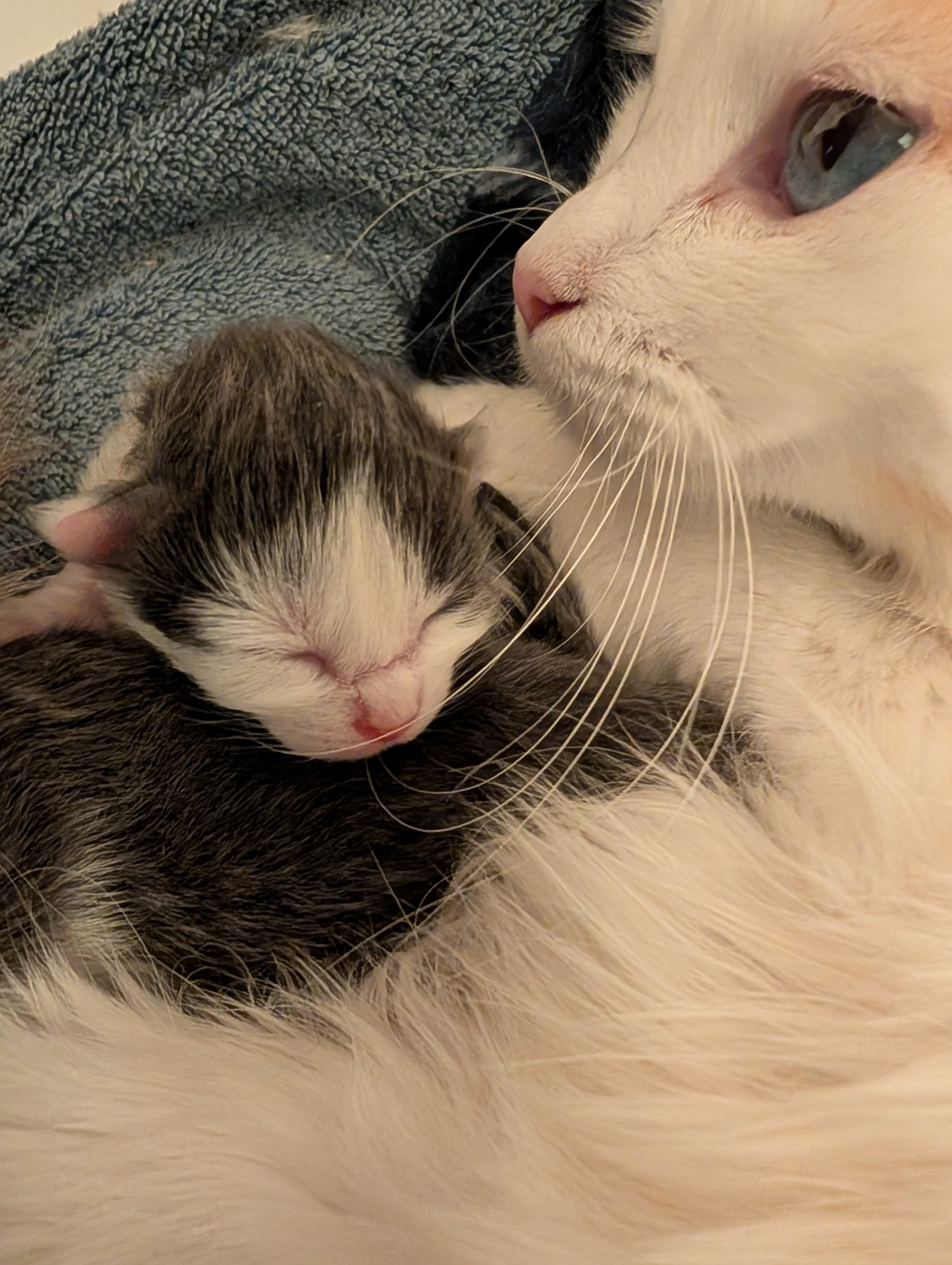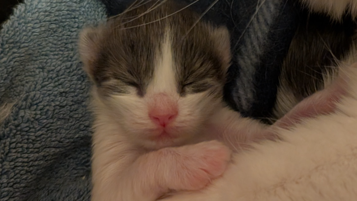 Nadiya, a young mama cat, was abandoned by her owner and had her second litter in just four months. I brought home Nadiya and her three-day-old kittens, and now they're safe and settling in. This little family of four is all named "Hope" in different languages: Nadiya, Spero, Hopper, and Kibou. My goal is to get them healthy, help them grow, and find them loving forever homes once they're ready to be spayed/neutered.