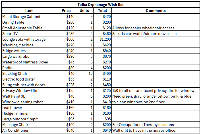 I will do the normal shopping experience of toys/clothes for the kids, as well as an excursion or two. The orphanage has shared with me a wishlist of items that it needs in case you want to sponsor a specific purchase.
