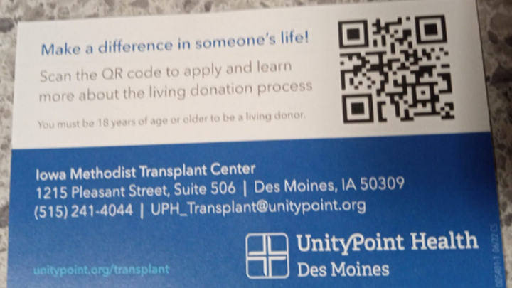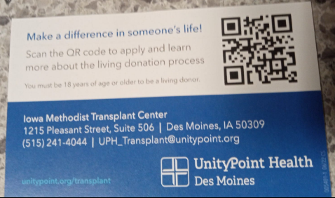 Thank you for taking the time to read my story. If donating a kidney to me is something you would like to consider, I would be happy to tell you more about my story and explore the process of determining if you are a match for me. You can also contact my transplant center directly at _5152414044_______.