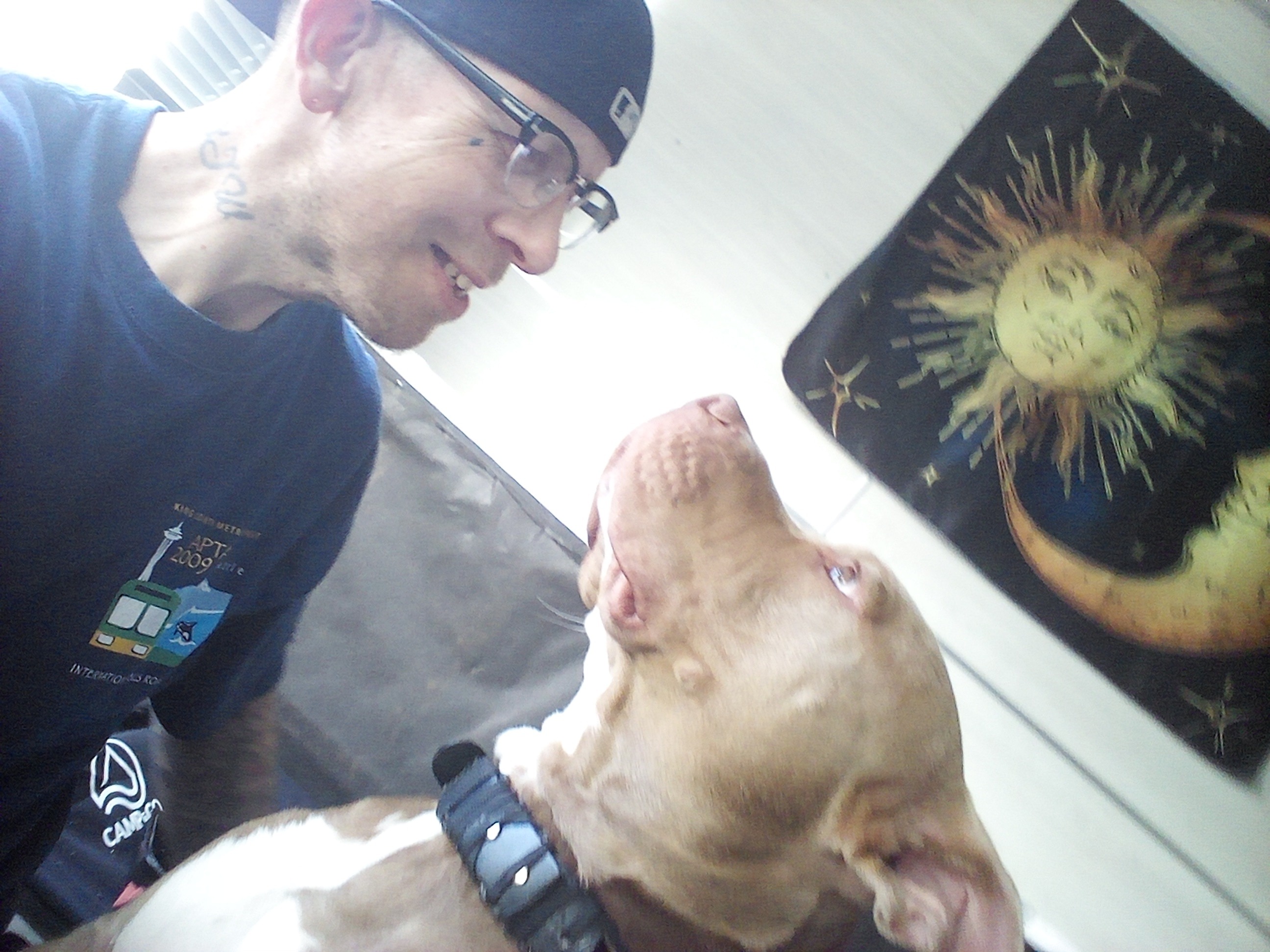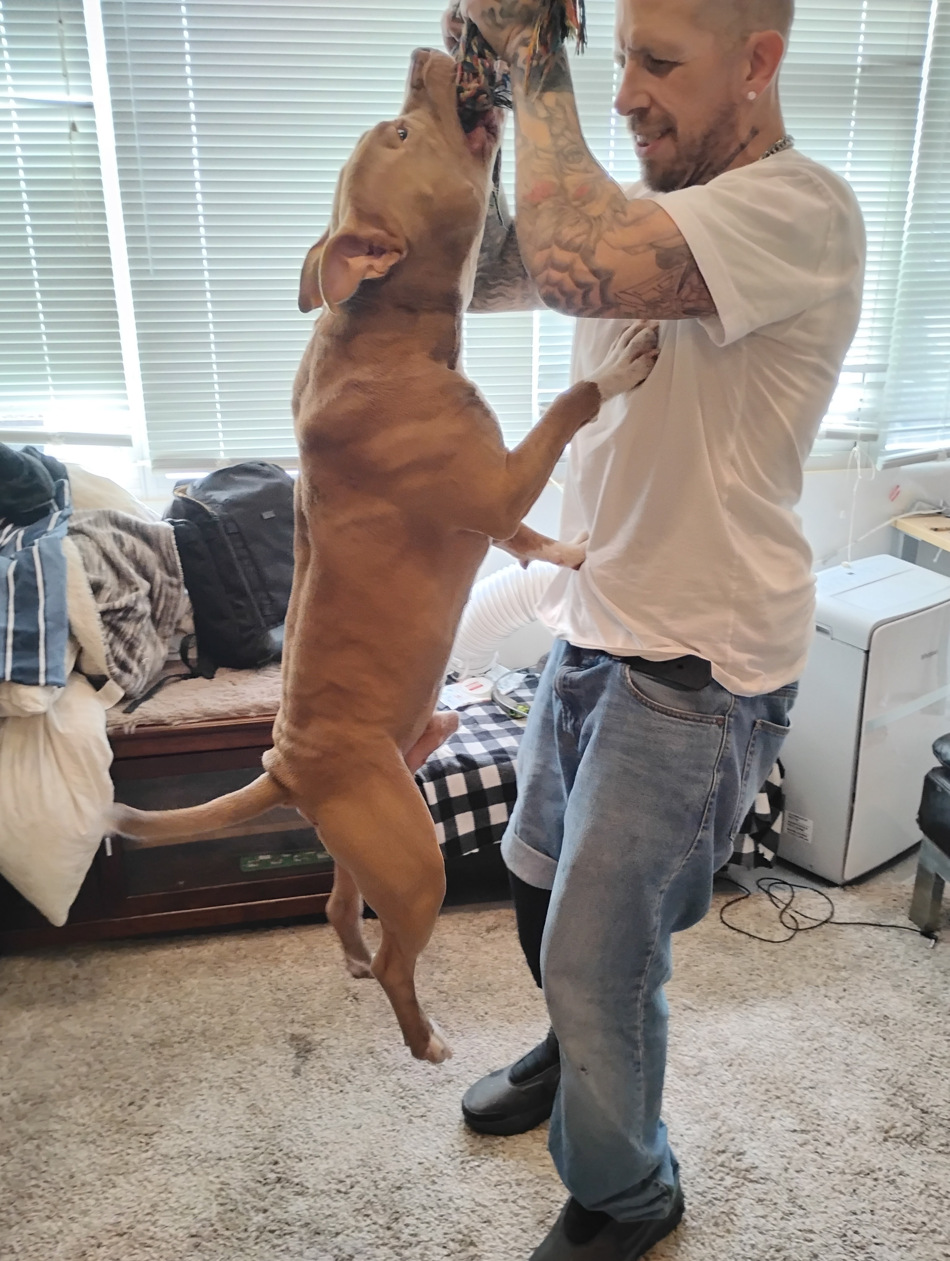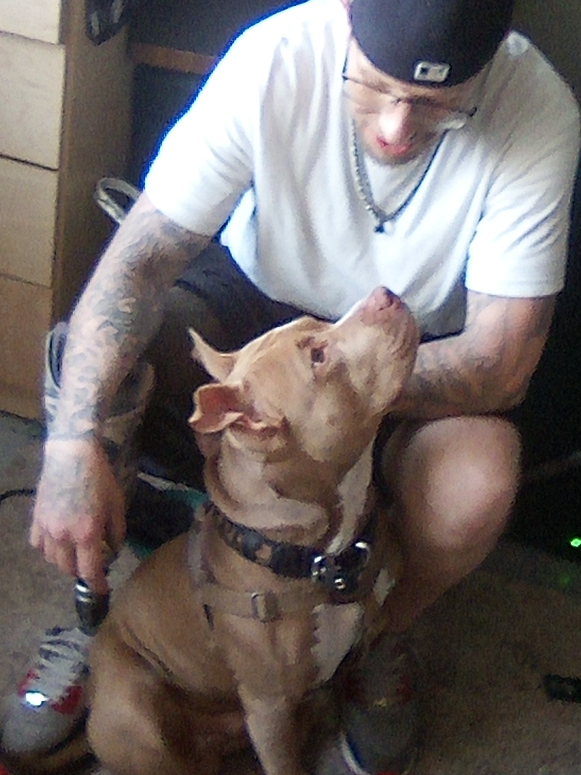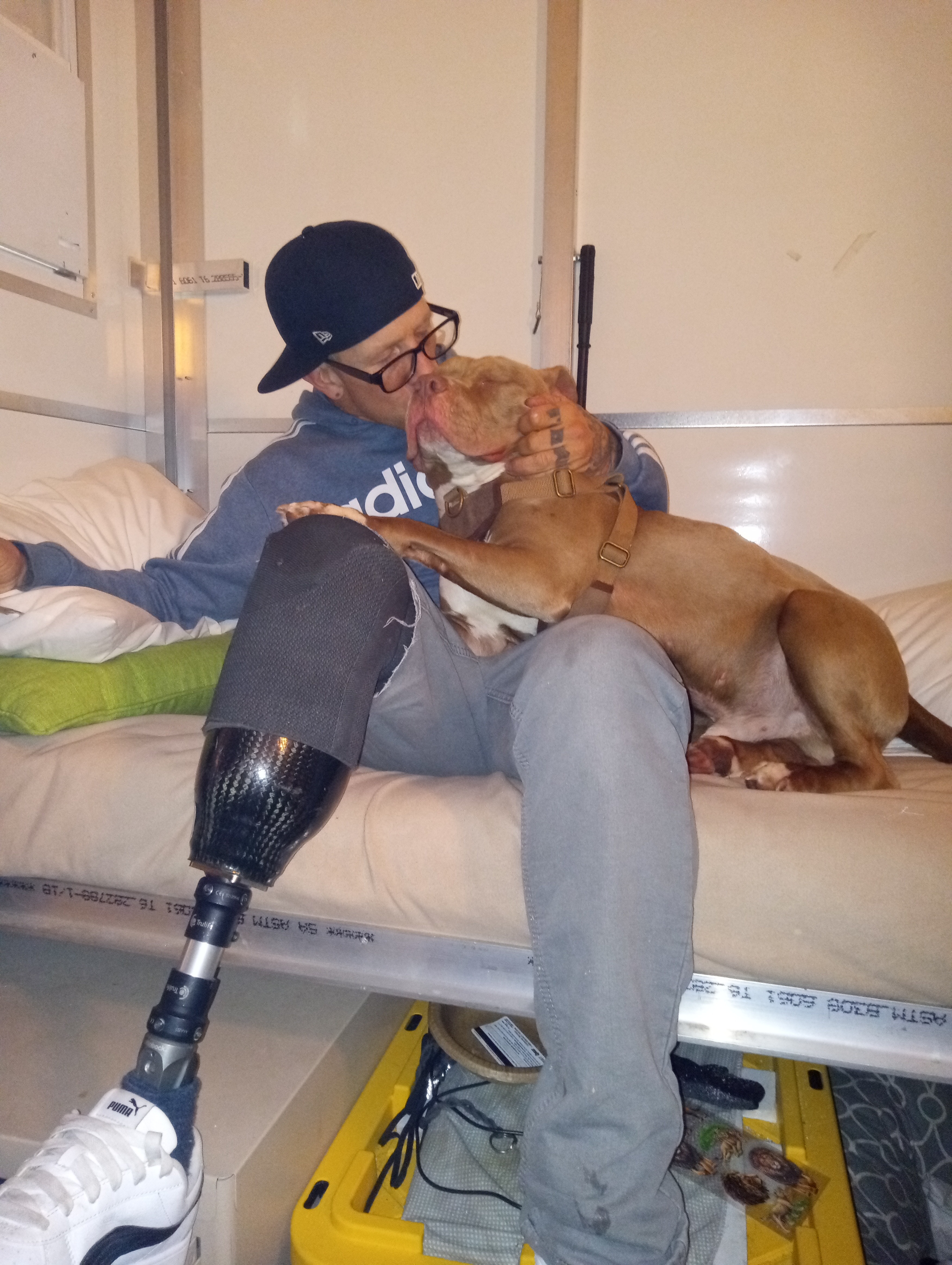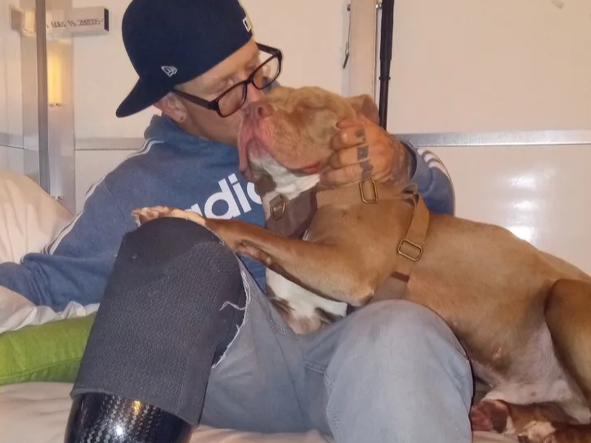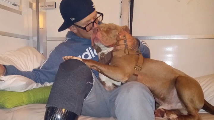 Hi folks, my name is Matthew Stratton, and I am a recovering drug addict. I've spent almost all of my adult life in prison, and when I wasn't in prison, I was probably in some alleyway trying to get my fix. I am 703 days sober from everything. When I was released from prison a few years ago, I ended up getting robbed and shot in the process. I was shot in my right leg and had to have it amputated. I get around okay on the prosthetic leg that I have, but since I only have the minimum of insurance, they will only pay the least amount possible. I have a dog now; his name is Tank. He is a red nose pit bull, and I don't know what I would do without him. I owe most of my sobriety to him and, of course, God. But if I didn't have Tank, I wouldn't really have a reason to get out of bed every day. He needs me, and I need him.