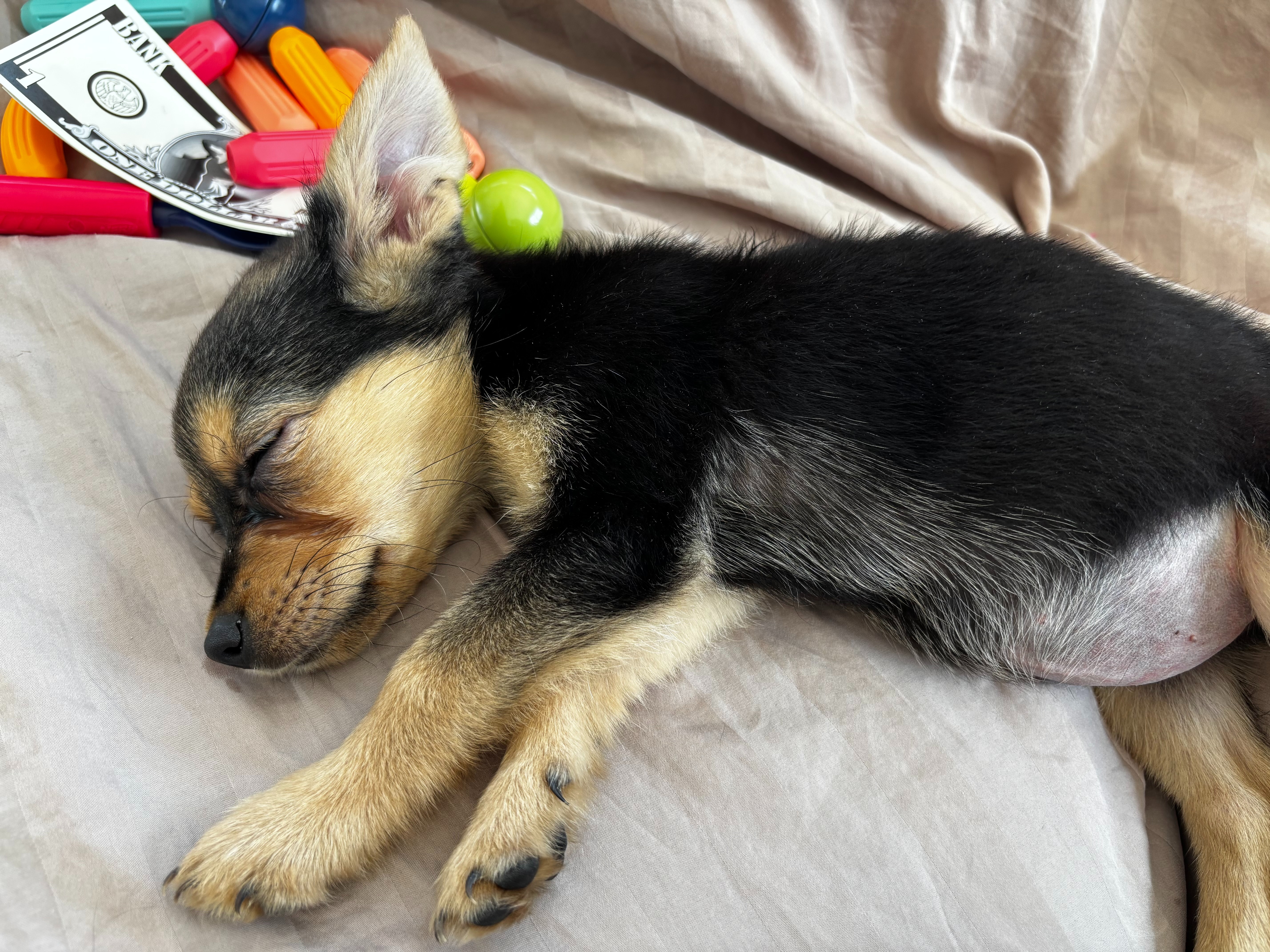 Minnie is 10-12 weeks old. She weighs 3 pounds. She loves to eat and bring her toys where ever we go.