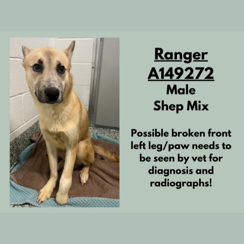Ranger came from Rowan County Animal Shelter, where he waited nearly three long weeks for someone to see him… to choose him… to give him a chance at a real home. During his time there, a kind volunteer, Connie, took him to be evaluated, and he was initially diagnosed with what was believed to be a sprain—later thought to be a small fracture.