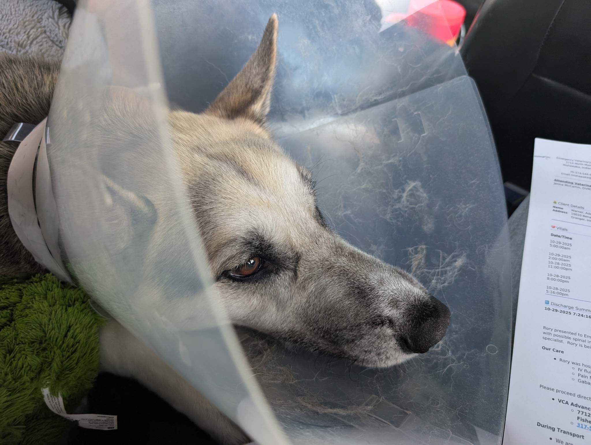 Rory is a German Shepherd Husky mix that loves to run and play! Unfortunately, our curious girl managed to get out of the gate in our fence and decided to check out something across the busy road adjacent to our home. That evening, of October 28th, she was struck by a vehicle as she made her way across the street. In doing so, the collision left her with slightly punctured lung, a fractured pelvis, some internal bleeding, and most all a misaligned vertebrae that is pushing down on her spinal cord forcing her to be in pain and causing weakness in her back legs. The money donated will not only be enough to cover surgery and the doctor visits needed, but will also restore a sense of life in our favorite fur baby!! No worries if you can’t donate, but please share to people you know in order for Rory’s story to reach as many people as possible.