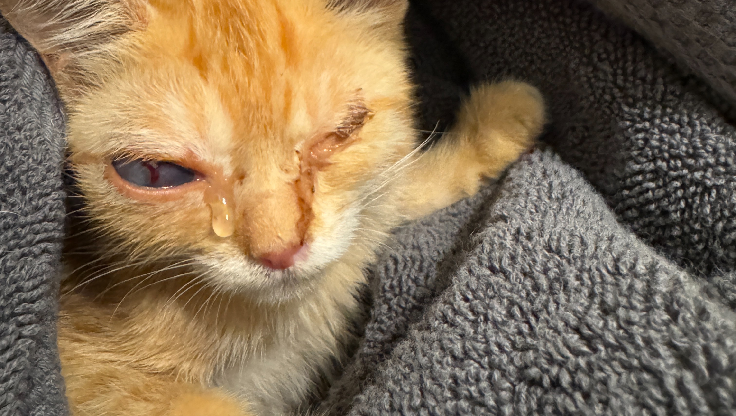 One of the most critical issues right now is the kitten's bulging eye, which will have to be surgically removed. We're hoping to save the second eye with urgent medical care. On top of that, the kitten is suffering from a respiratory infection, struggling to breathe with severe coughing and wheezing. Without immediate life-saving interventions, this kitten won’t survive much longer.