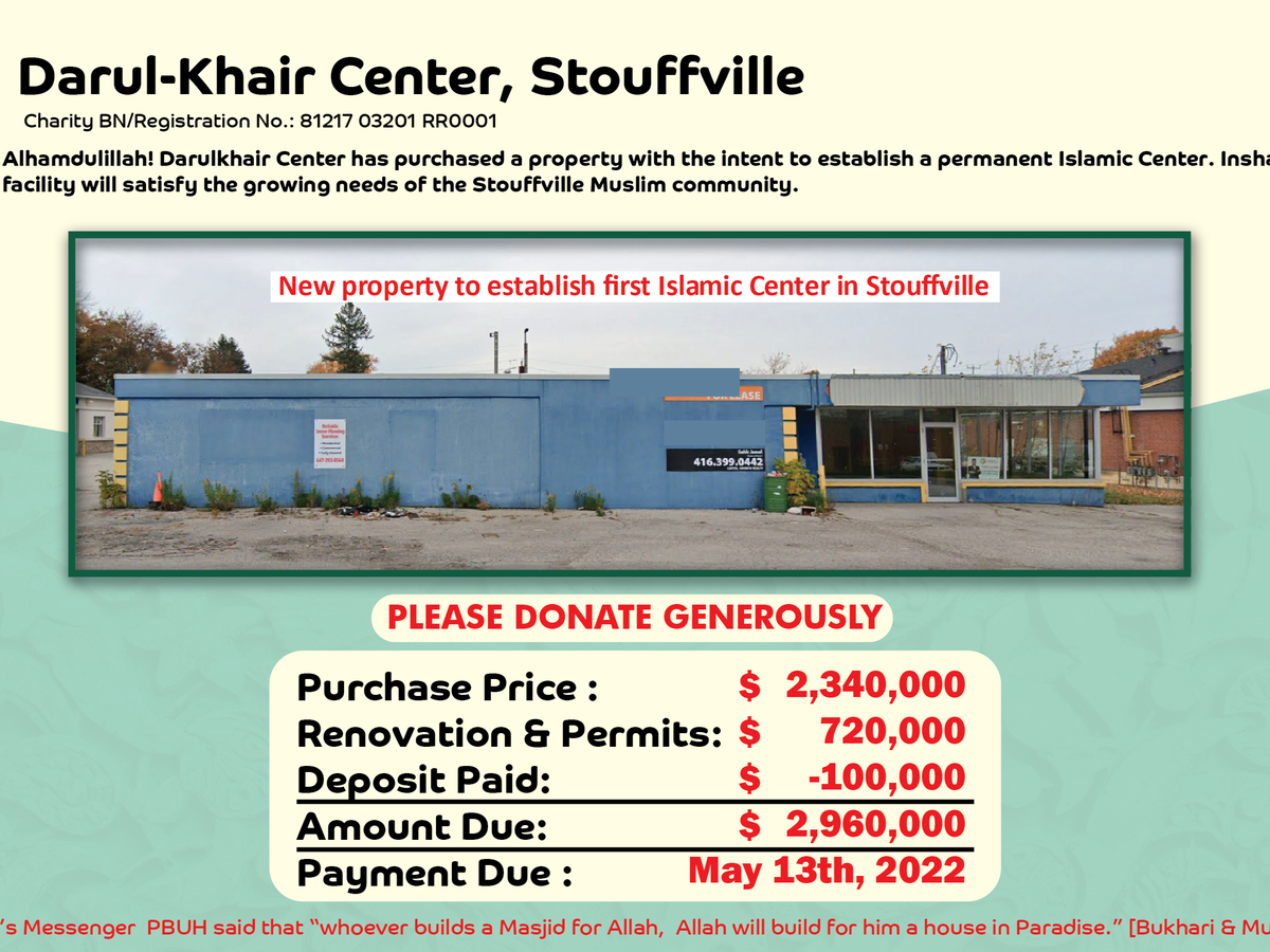 Let’s begin the new year 2022 with Sadaqa-e-Jariyah* by donating for the establishment of the first Islamic Center (Darul-Khair Center) in Stouffville, Ontario, Canada!