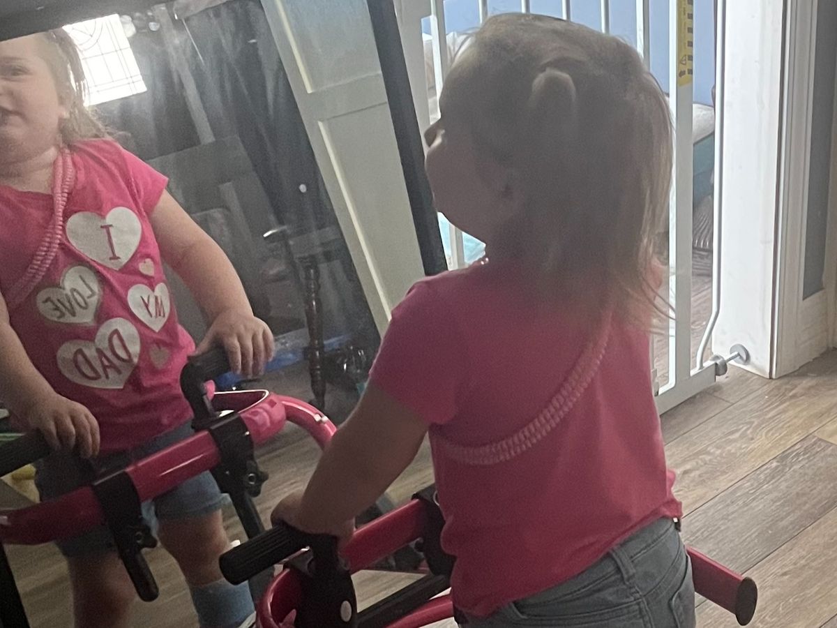 Madeleine does not walk, yet but will take up to 100 steps in her gait trainer that has been striped down to a basic walker. She can stand independent for 5 seconds at a time- the gait trainer is decorated to look like a jeep for intrinsic motivation purposes.
