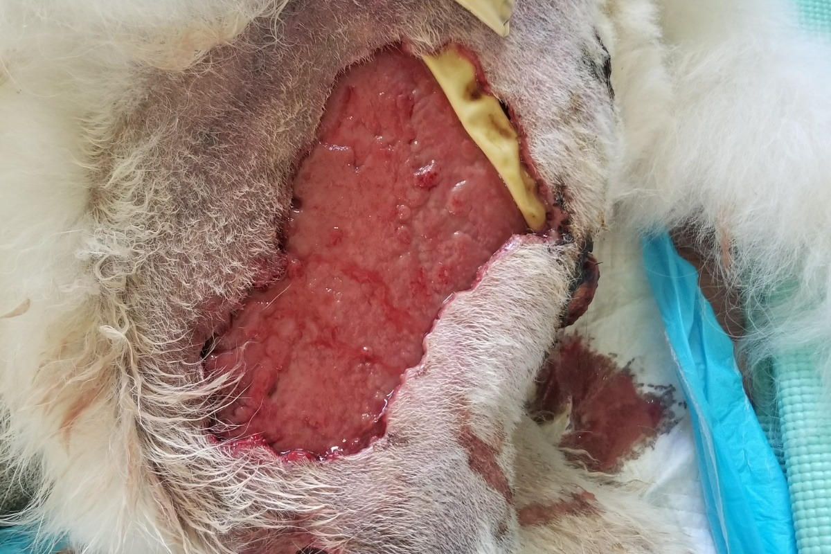 To get around Beaux was transported by gurney and a lifting harness because he had no use of his two hind legs. It was touch and go there for a while. The vet didn’t know if he was going to make it or not. Beaux’s skin began to slough off leaving him with a 7” by 5” open wound on his left leg. At one point Beaux was facing amputation but has since gotten past that medical risk prediction. While Beaux is responding well to his current medical treatment, he's still not out of the woods yet. He's facing a long road to recovery with months of veterinary visits lined up ahead. At some point during his treatment, Beaux will undergo surgery to have the hole in his leg closed up but until then it is still too early to have the surgery perform. Beaux's last complete blood count (CBC) results revealed both his red and white blood cell count are very low, and his body is leaking protein causing anemia.