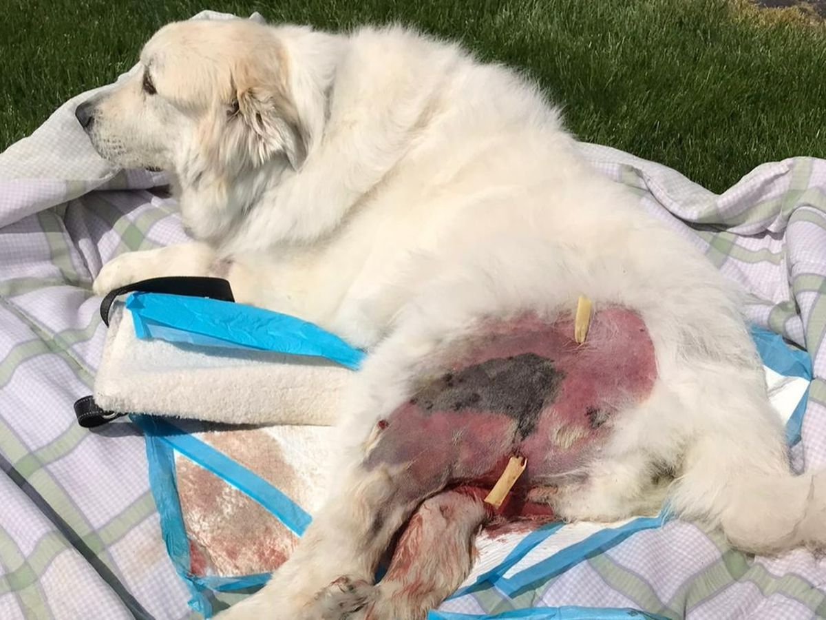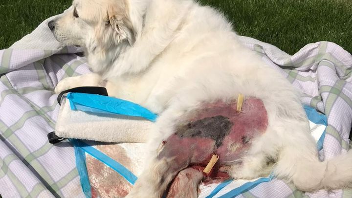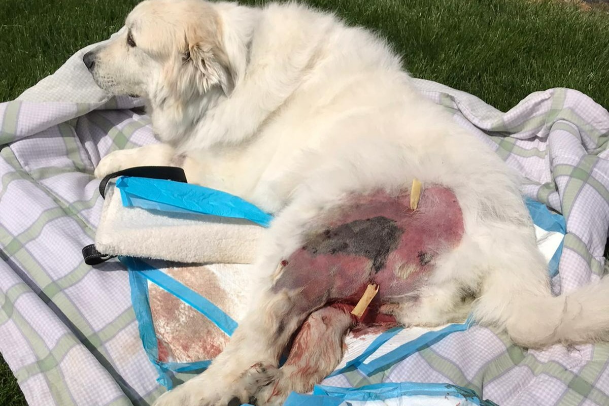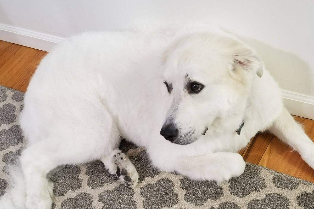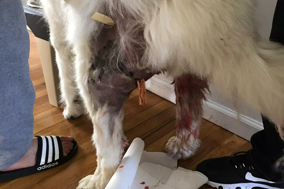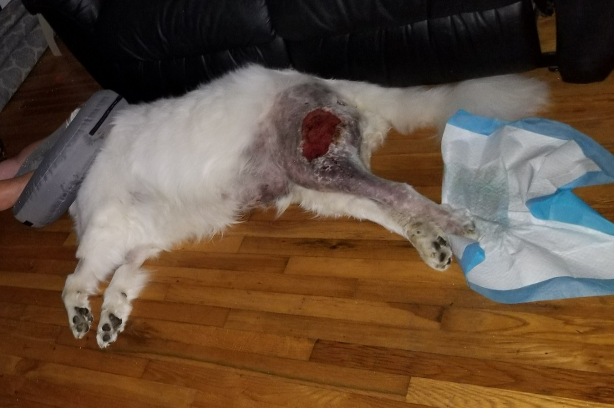 Beaux (pronounced Bo) is our 8-year-old, 115 lbs., Great Pyrenes Mountain dog, whom we rescued 7 ½ years ago from Bideawee. He's our world. Beaux has had many medical issues from the time of adoption to now. Beaux is the true definition of a fighter. He was stricken with canine distemper as a puppy and survived but was left with a neurological health disorder. As a result, Beaux suffers from grand mal seizures. His seizures are controlled with daily doses of phenobarbital. Over a month ago, Beaux suffered a slip and fall and as a result, he injured his left hind leg. After a day of limping, we took Beaux to see his veterinarian. X-rays were pulled and bloodwork was ordered. Beaux was diagnosed with cellulitis, seroma, edema, and a bacterial staph infection. His infection was aggressive and rapidly spreading from his left leg to his right leg. Beaux was unable to walk for two weeks while receiving daily treatment at the veterinary hospital. Due to the rapid spread and aggressive nature of his infection, the vet thought it would be best to fight back with the same type of aggressive medical treatment if Beaux stood any chance at beating this infection. During his first nine days of in-house hospital care, Beaux received two different types of antibiotic intravenously and was placed on an IV fluid drip since he wasn't eating. On the eleventh day of treatment, he had a surgical drain put in his left leg to alleviate the massive swelling.