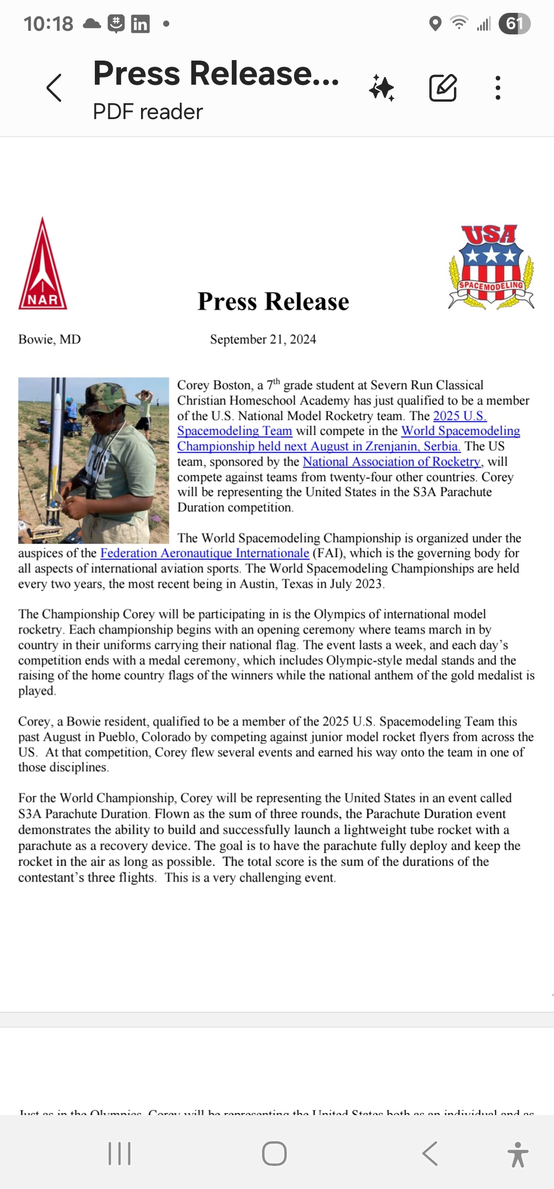 Hi! My name is Corey Boston, and I have some exciting news—I’ve been selected to represent Team USA at the 24th FAI World Championships for Space Models in Serbia this August 21–28, 2025!