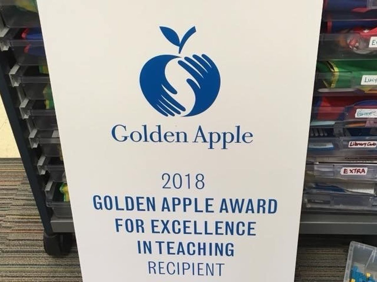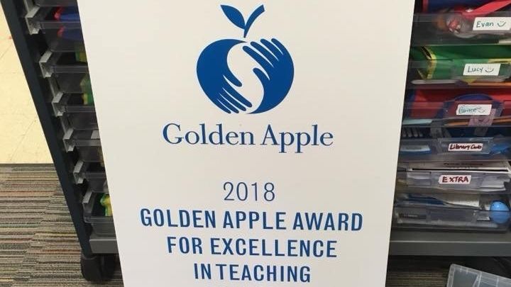 My wonderful first grade teacher, Lisa Buchholz, won the 2018 Golden Apple Award for excellence in teaching.  An amazing achievement and honor.