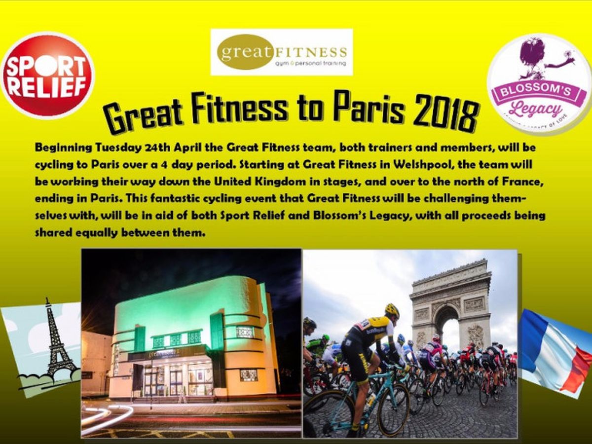 Beginning Tuesday 24th April the Great Fitness team, both trainers and members, will be cycling to Paris over a 4 day period. Starting at Great Fitness in Welshpool, the team will be working their way down the United Kingdom in stages, and over to the north of France, ending in Paris. This fantastic cycling event that Great Fitness will be challenging themselves with, will be in aid of both Sport Relief and Blossom’s Legacy, with all proceeds being shared equally between them.