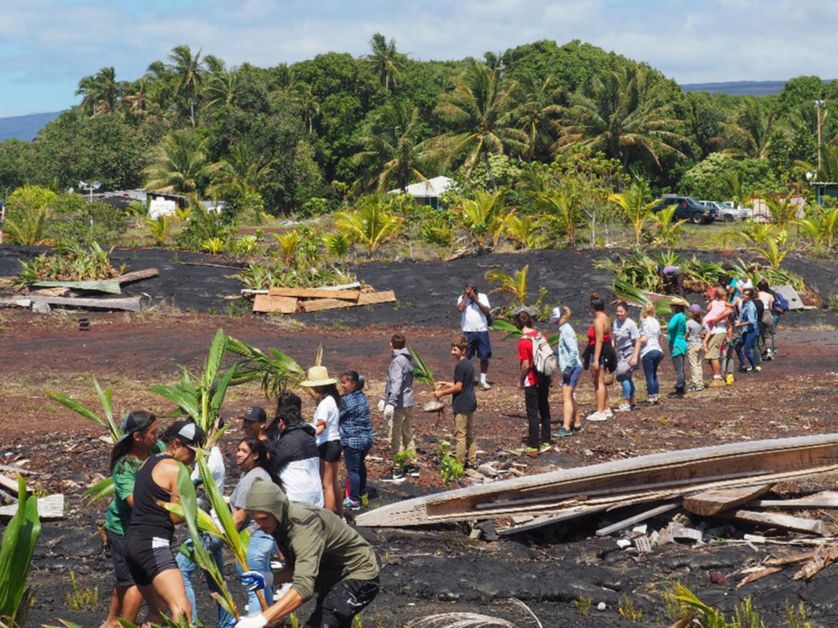 This year, we also hosted our first annual Coconut Planting Festival. Over the week of Earth Day 2019, we brought education for sustainability to the classroom, visiting local high schoolers to educate about the benefits of reforestation and afforestation for capturing carbon from the atmosphere. Then these students joined us, over 100 high school of them, to help plant 1,000 coconut trees and 100 culturally relevant Hala trees on the fresh lava land at Kalapana, Hawai’i.