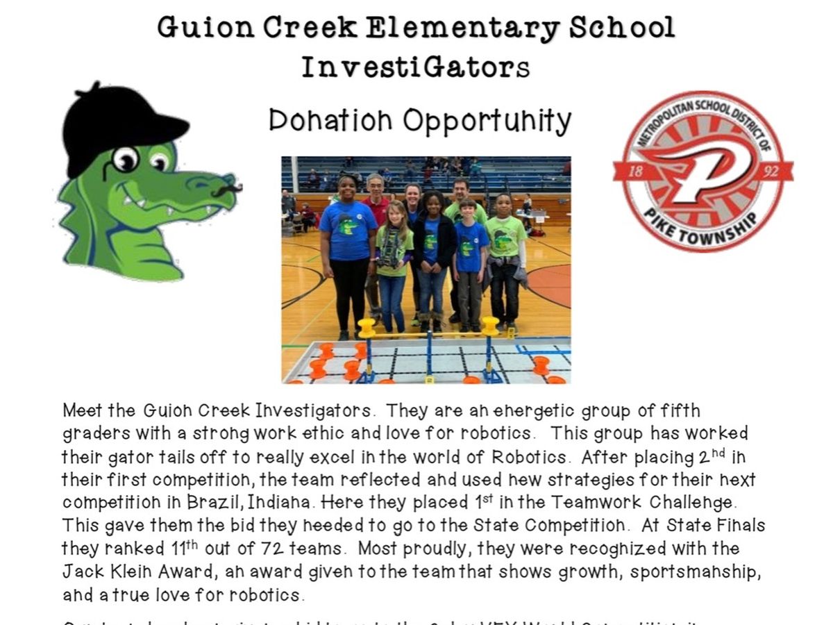 Meet the Guion Creek Investigators. They are an energetic group of fifth graders with a strong work ethic and love for robotics. This group has worked their gator tails off to really excel in the world of Robotics. After placing 2nd in their first competition, the team reflected and used new strategies for their next competition in Brazil, Indiana. Here they placed 1st in the Teamwork Challenge. This gave them the bid they needed to go to the State Competition. At State Finals they ranked 11th out of 72 teams. Most proudly, they were recognized with the Jack Klein Award, an award given to the team that shows growth, sportsmanship, and a true love for robotics.