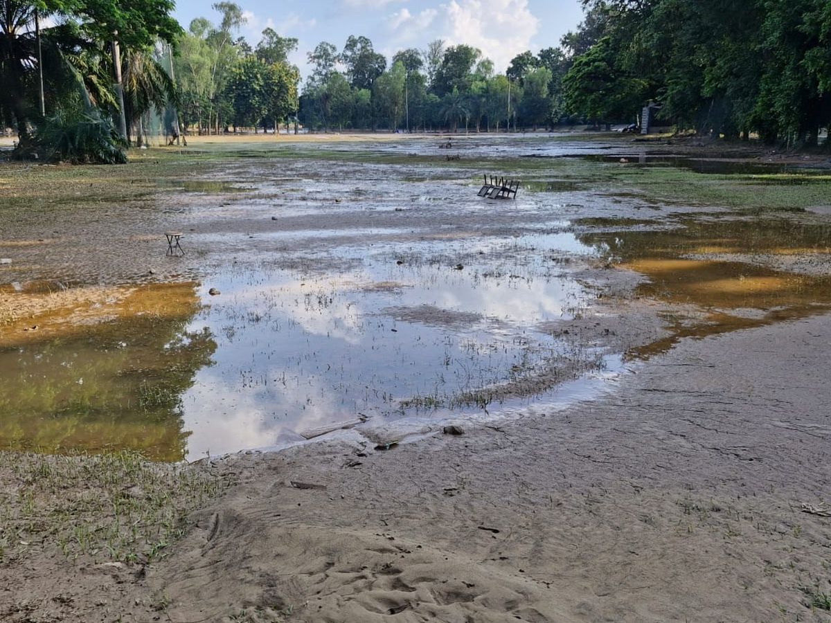 Work has seen the silt removed, leaving the ground without any turf. Much damage was also caused to equipment around the bar and office area belonging to the Sixes, which requires extensive repairs or replacement.