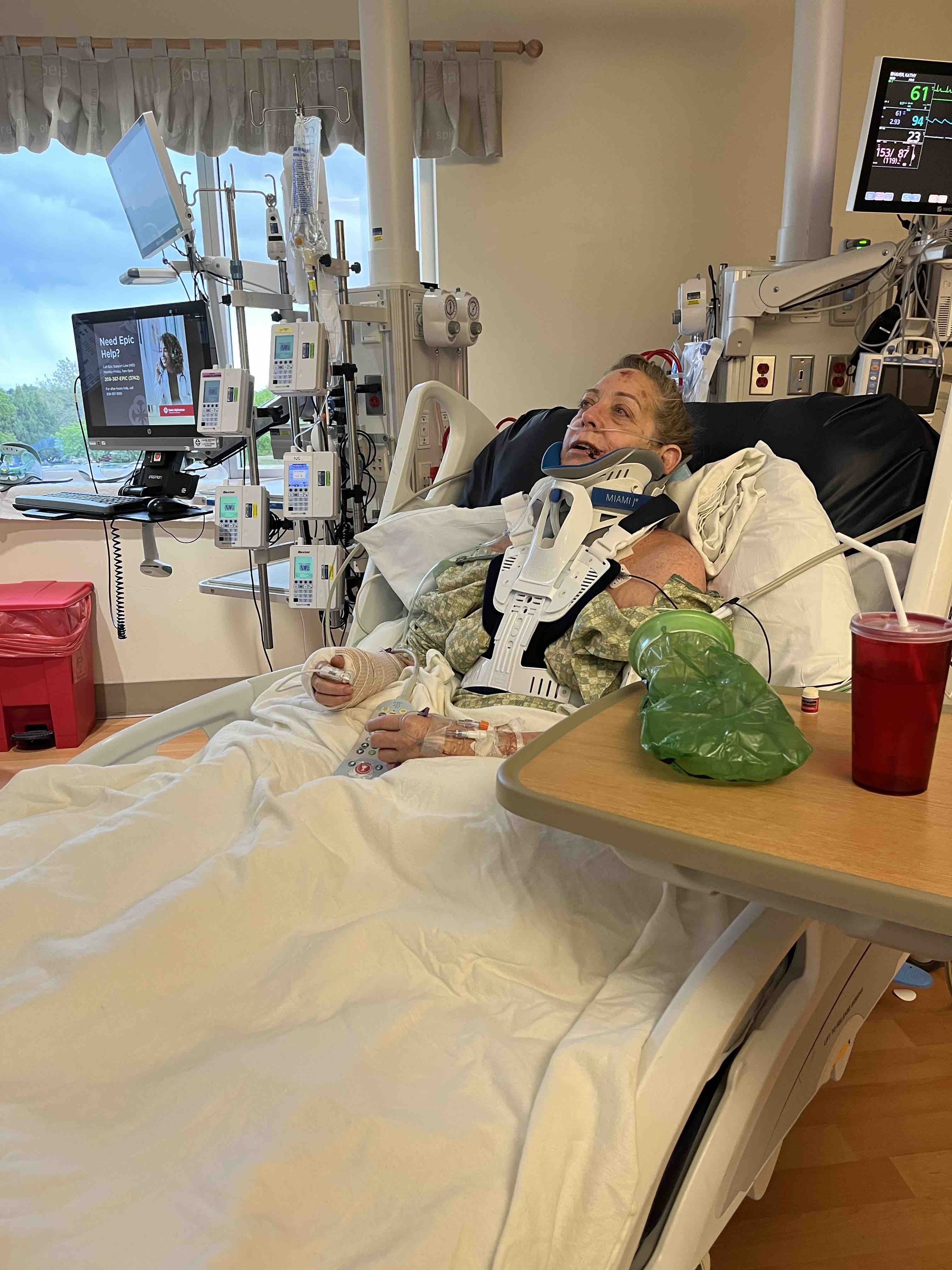 My mom Kathy was in an awful car accident in June. She suffered severe spinal injuries, broke her C6 and C7 vertebrae, suffered a broken wrist, and has nerve damage in her right arm. Surgery to repair the spinal canal was successful, but she has to learn to walk again on her own and needs continued physical rehabilitation and has a long long road ahead. She needs in-home health care and cannot work.