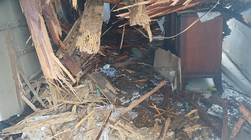 I'm a single mother of six I've been living at this address for over four and a half years I rent is paid on time I've been telling my landlord for months that we have black mold that the termites are eating out the place he doesn't want to fix anything slumlord anytime I call them you never picks up when I do get them he sends someone out 5 to 6 days later doesn't fix a thing I literally woke up came home from work this morning about 2:30 a.m. I work in Western I got home I heard the beam starting to crack once I heard the beam starting to crack I proceeded to wake my kids up and I said let me get y'all out and I started one at a time and it was 6 in total got everybody out and everything just fell down after that but with God's grace hopefully we'll be all right I just need help to find a place to stay we need help any type of help we really appreciate and accept it