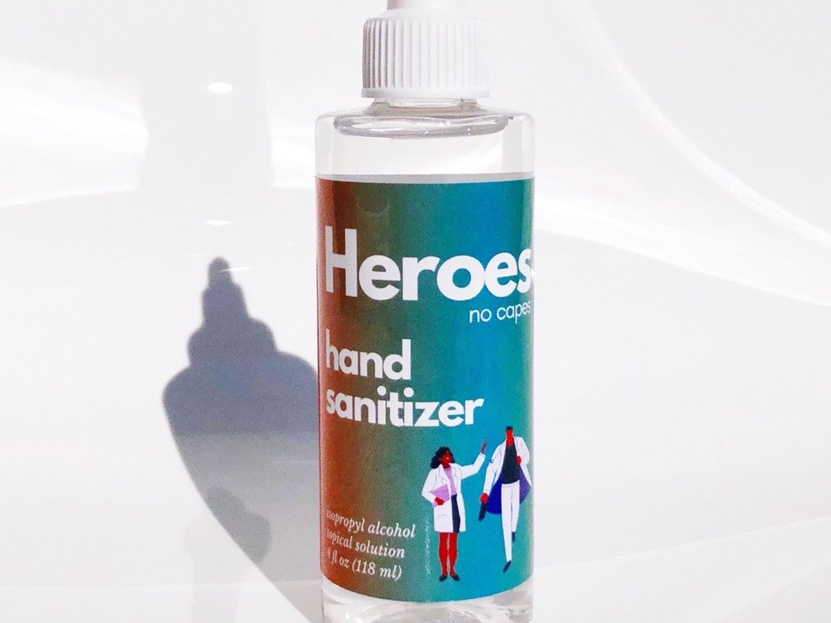 However, I wanted to make sure the final hand sanitizer would be as appealing and easy to use as possible. Ultimately, I came up with two ideas. First, I wanted to add a nice scent. The base formulation smelled really strongly of alcohol and chemicals, so I added some essential oils (like lavender and tea tree) to make it smell better. Second, I wanted to put a fun and recognizable design on the bottle, something that could be a tribute to all the heroic frontline healthcare and social workers fighting the pandemic. After trying a few design ideas, I stumbled upon the quote: “not all heroes wear capes”.