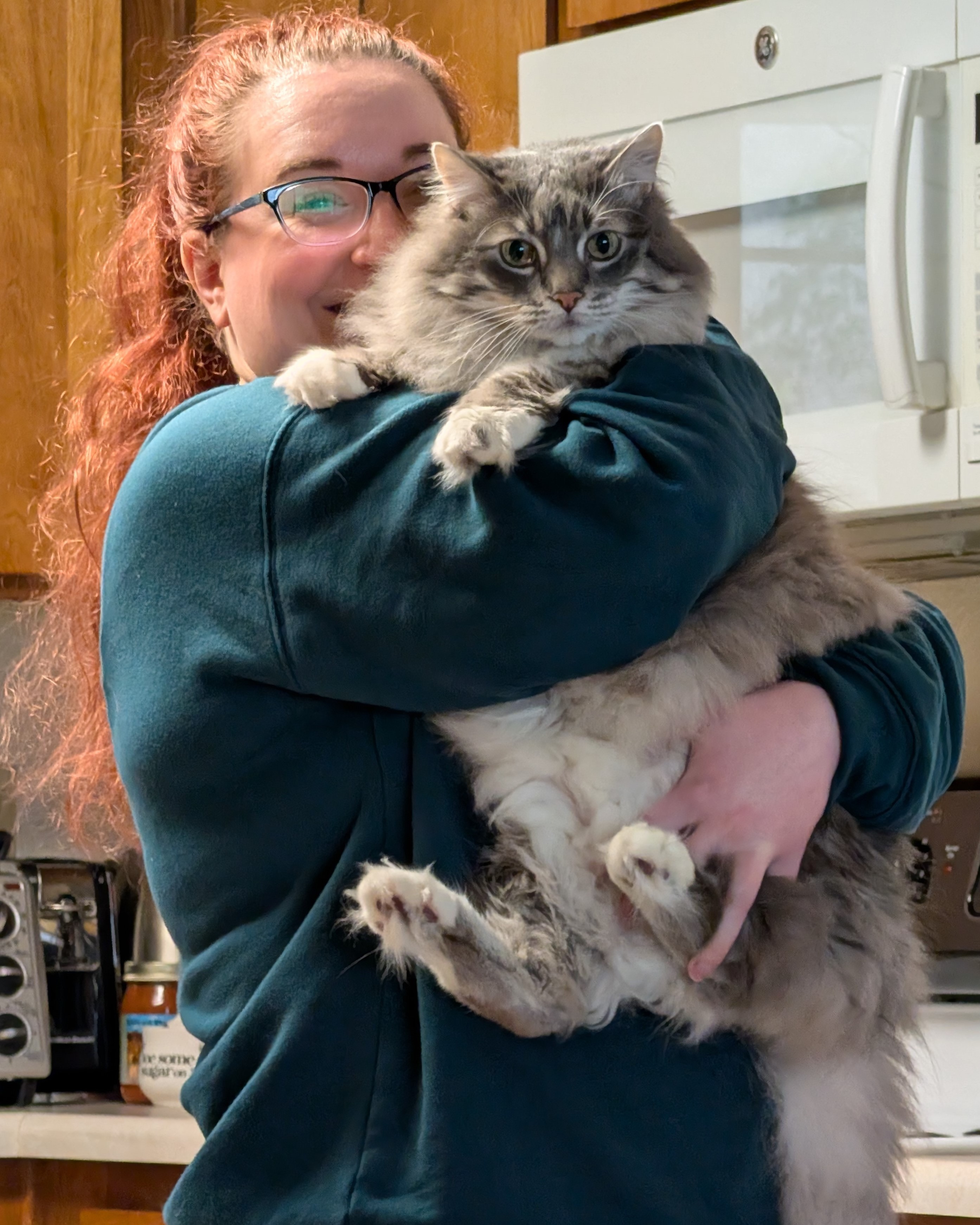 My eldest, Kirby, is a senior Maine Coon who was diagnosed with feline diabetes just one month before my surgery. I found myself suddenly navigating two major medical crises at once — one for each of us. He needs daily insulin injections, syringes, a prescription diet, glucose monitoring equipment, and veterinary visits with blood work every 15–90 days to stay stable and comfortable. Merlin and Nutmeg are thankfully healthy and thriving — but Kirby needs extra support right now, just as I do.