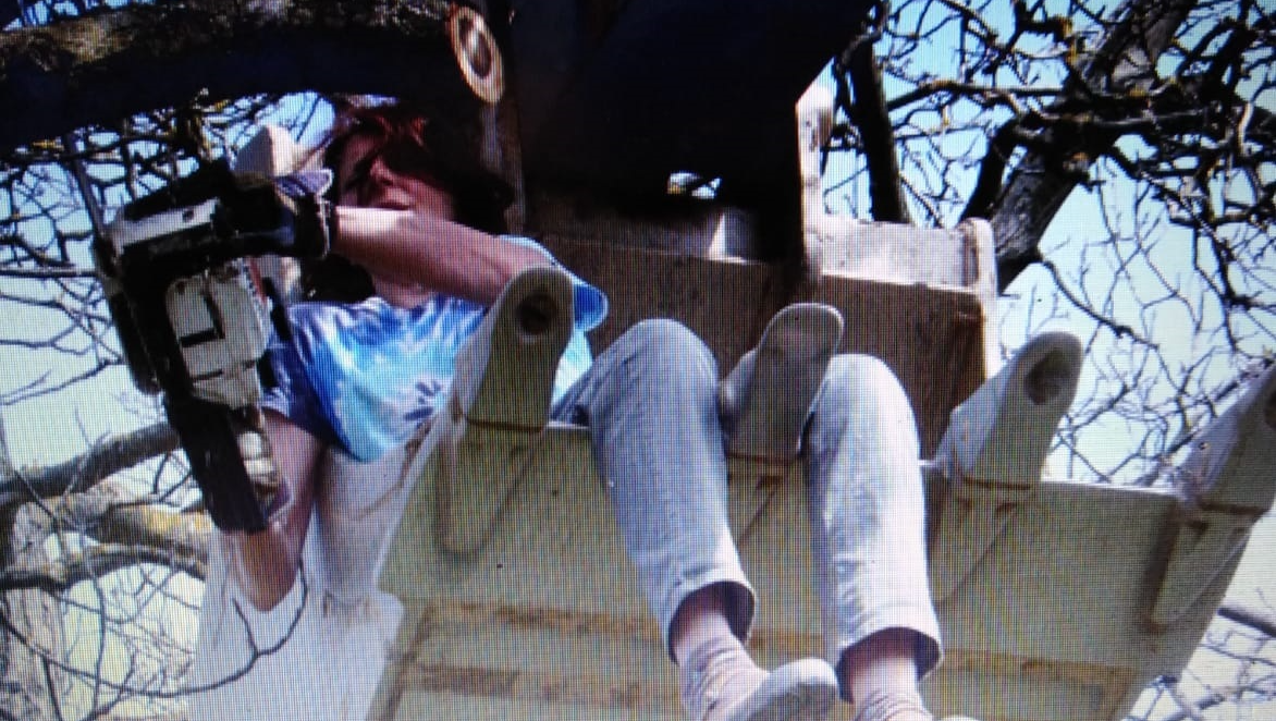 With her chainsaw sitting comfortably high in excavator's forklift to remove dead branches from a walnut tree for her neighbor on an adjoining property