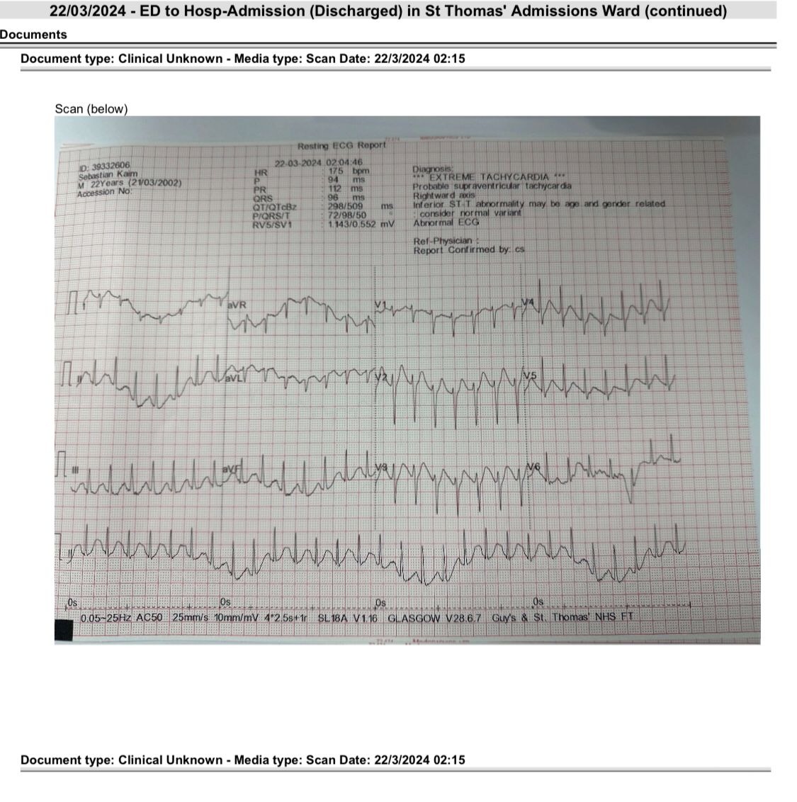 On 21.03.2024 everything changed. On my way home from meeting friends, I suddenly collapsed on the bus. When I regained consciousness, I had this weird tingling chest pain and couldn’t move the left side of my body. Luckily, an ambulance arrived quickly and brought me to the resuscitation room at St. Thomas Hospital. I arrived there with a heart rate of 195 and a cardiac arrhythmia. I had a lot of other gnarly markers as well, my blood pressure was 156/137, I had severe clonus and elevated lactate, just to name a few. It wasn’t until the next day that I fully realised how serious this episode had been.
