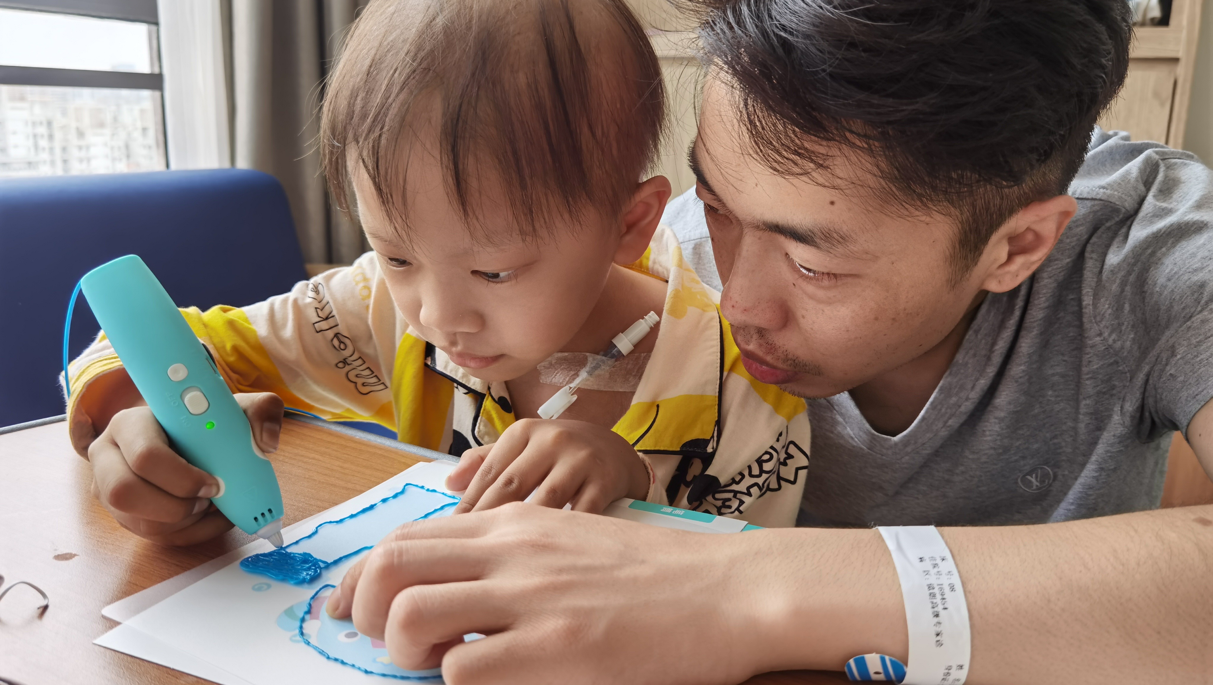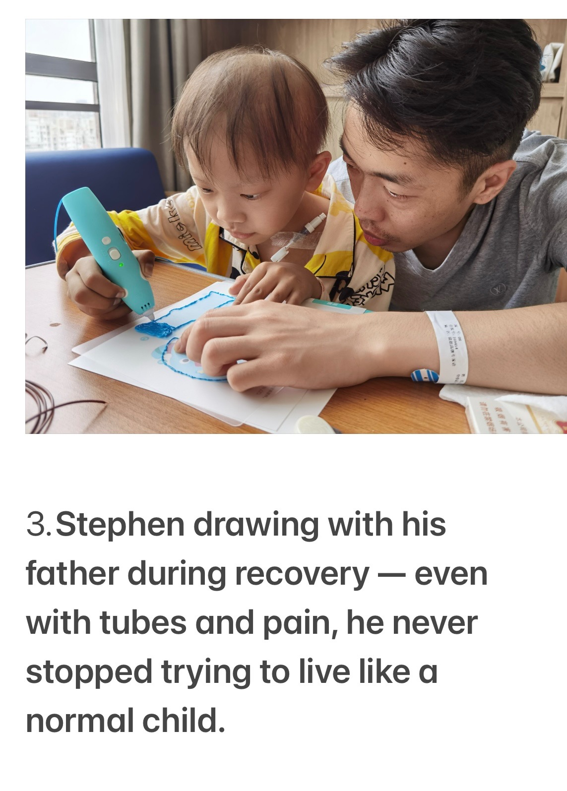 3. Stephen drawing with his father during recovery — even with tubes and pain, he never stopped trying to live like a normal child.