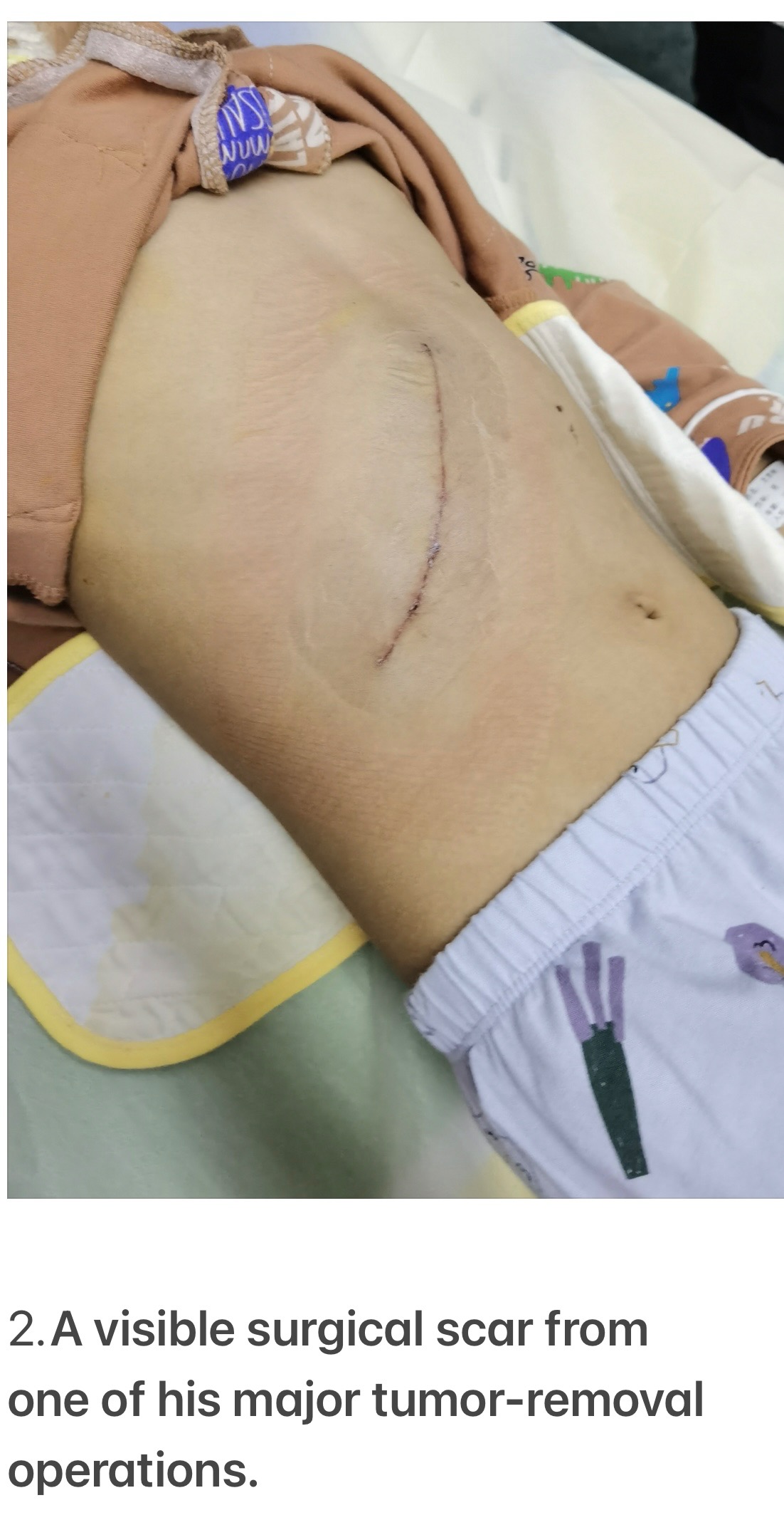 2. A visible surgical scar from one of his major tumor-removal operations.