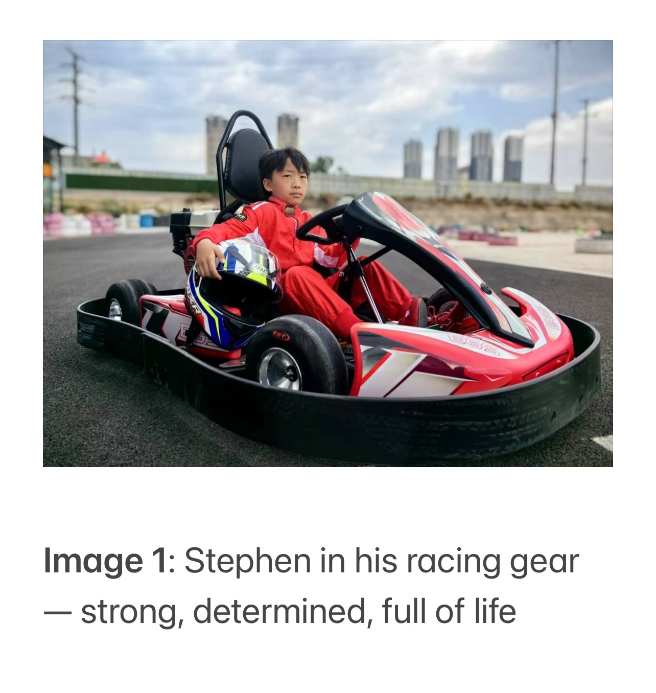Image 1: Stephen in his racing gear — strong, determined, full of life