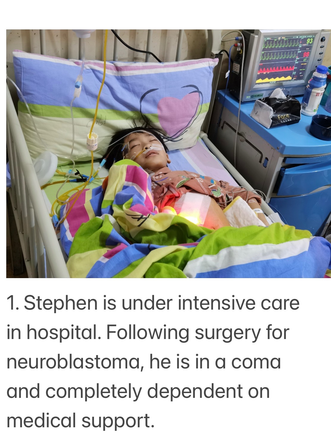 1. Stephen is under intensive care in hospital. Following surgery for neuroblastoma, he is in a coma and completely dependent on medical support.