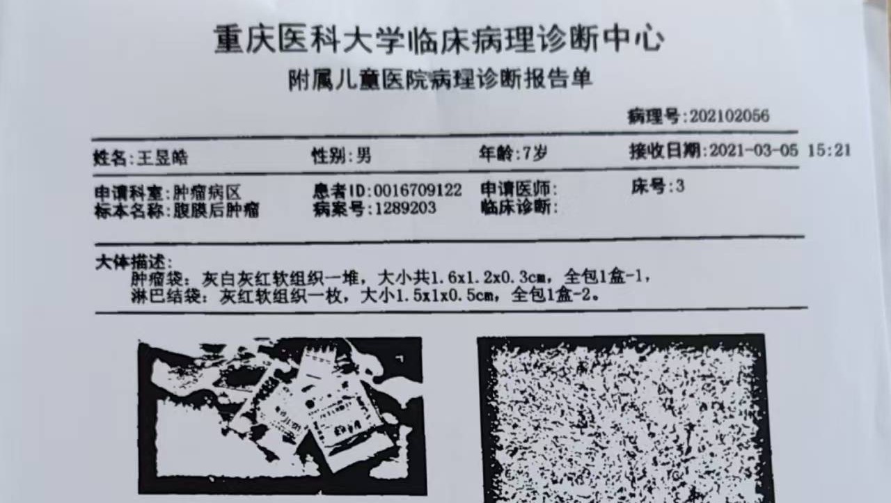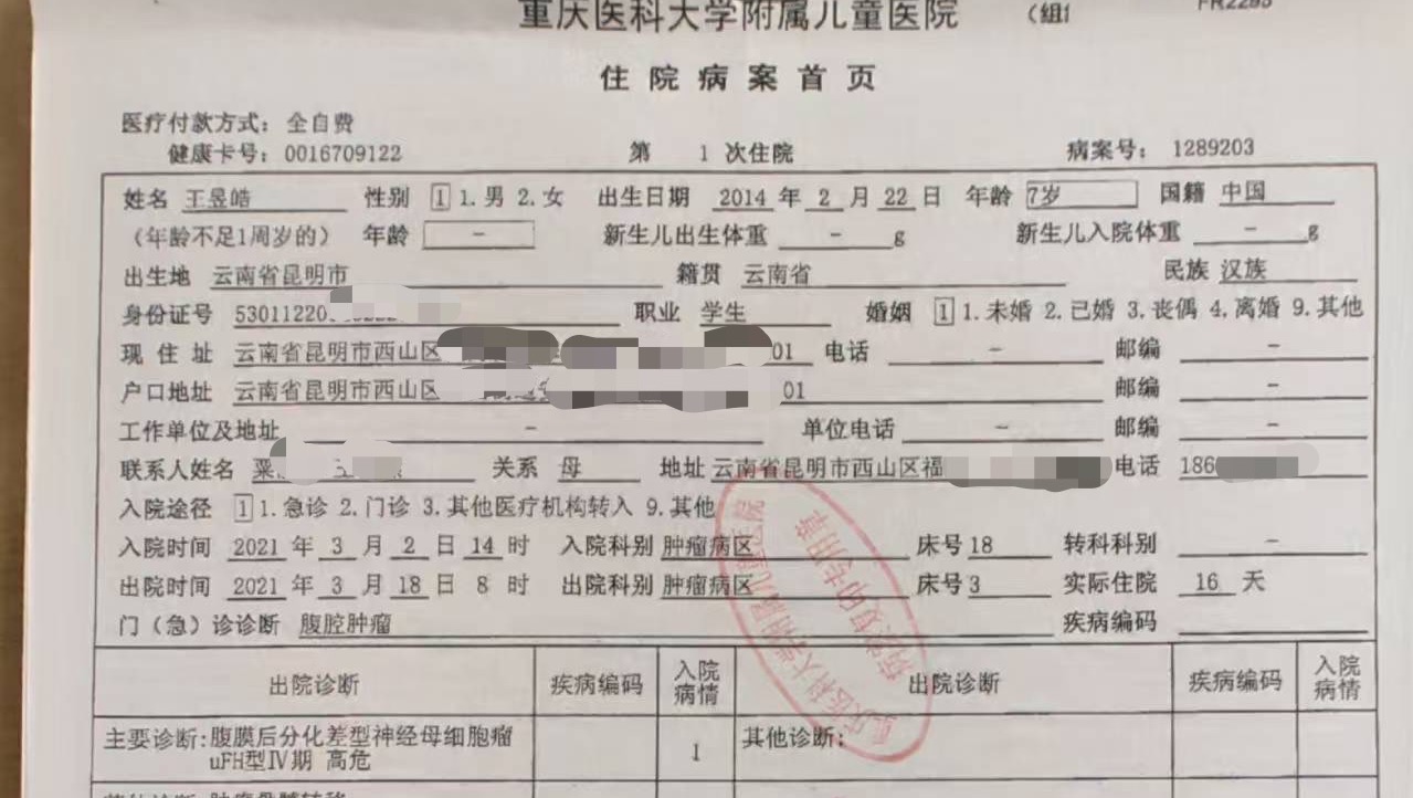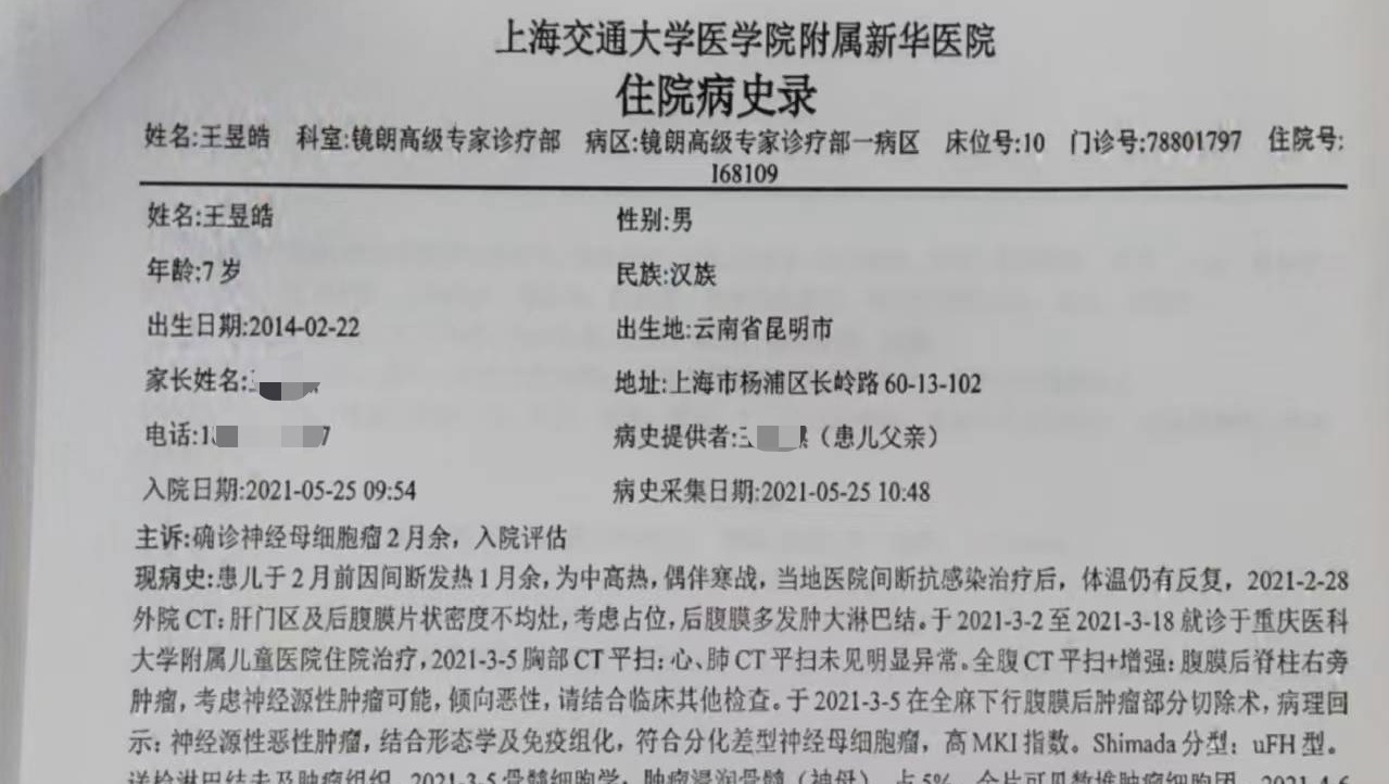 This is the original hospital diagnosis from 2021, issued by 2 public hospital in China, confirming Stephen’s diagnosis with neuroblastoma.