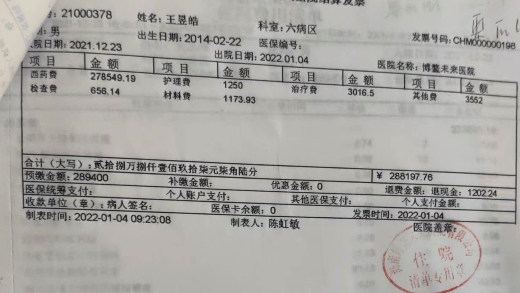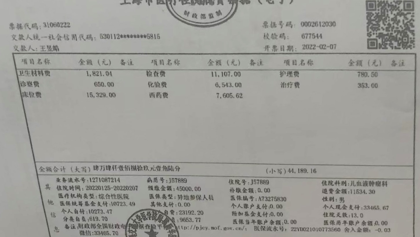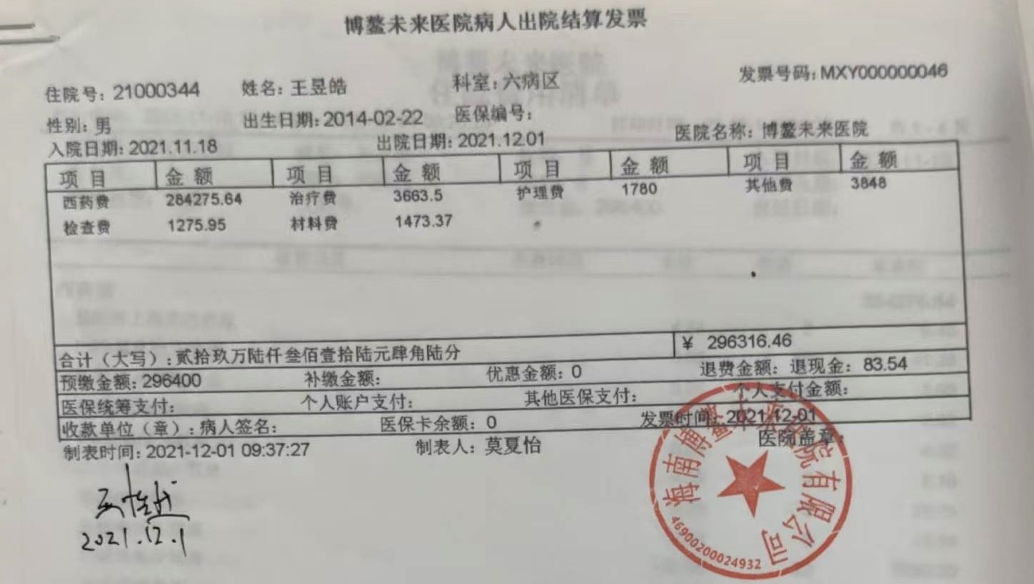 This invoice shows part of Stephen’s medical expenses for chemotherapy at Boao Future Hospital in Hainan.