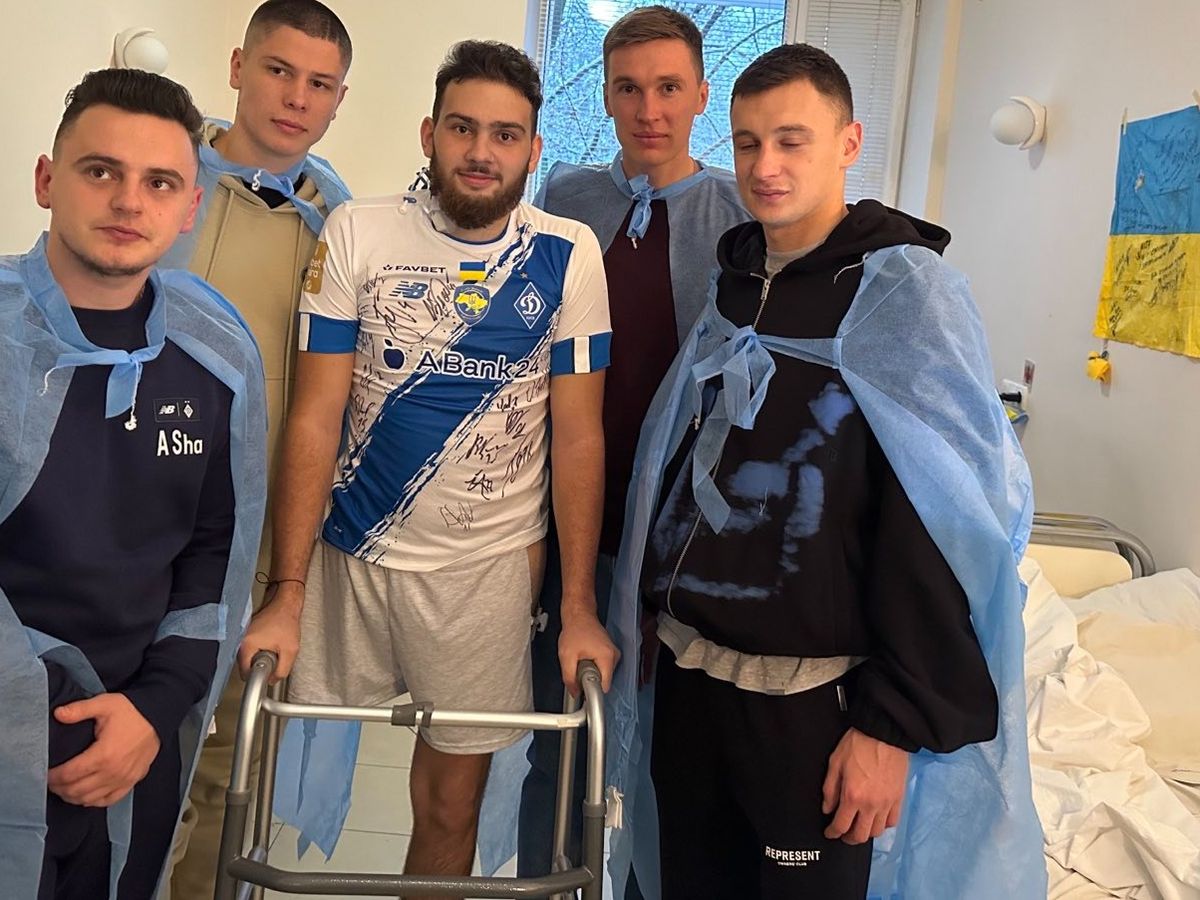 Photo of Lyonia with four Dynamo Kyiv football players when they visited him at the military hospital in Kyiv.