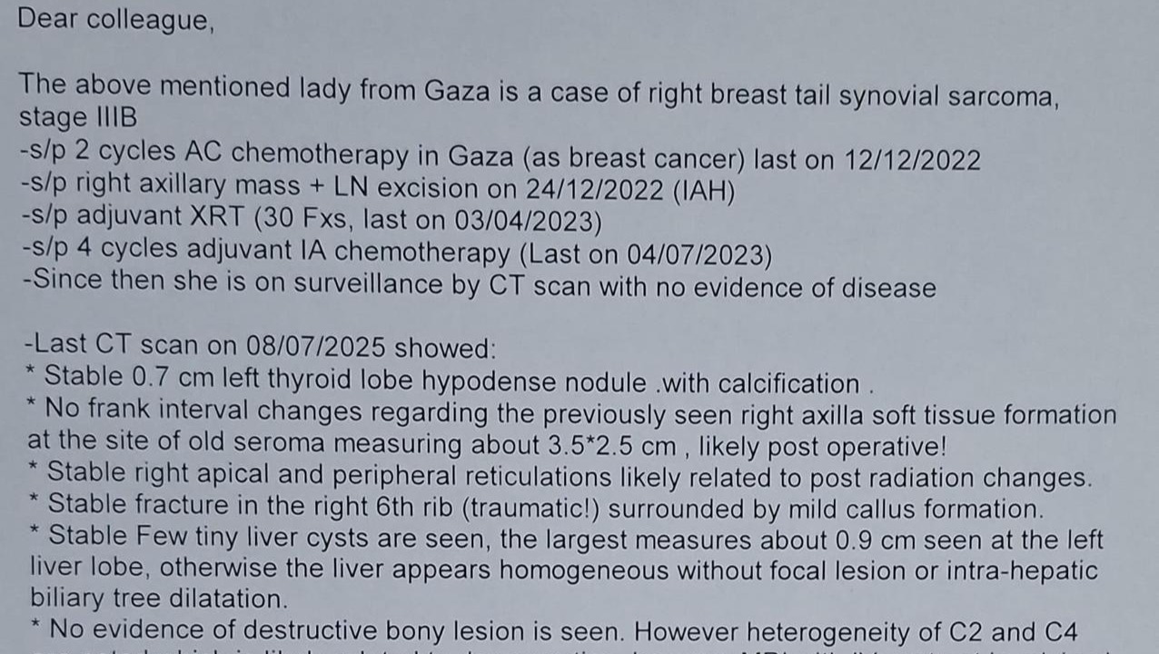 While I struggle with my illness away from home, my greatest pain is knowing that my husband and children are still trapped in Gaza, facing unimaginable suffering every single day.