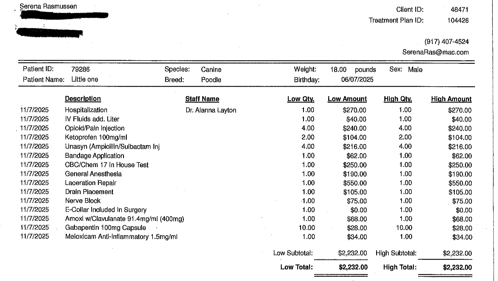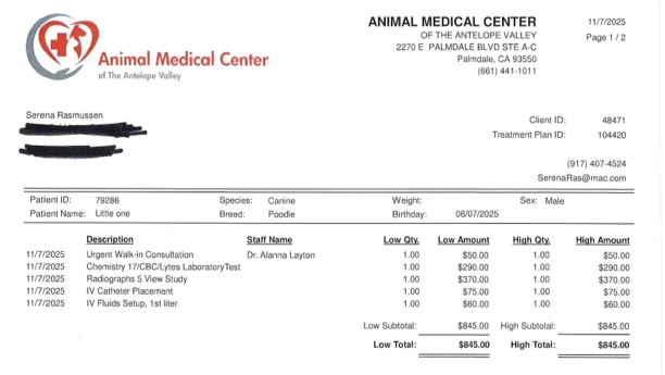 Here are some of the his vet bills. I paid the last one which was over 1k but the vet cannot send it to me until he is discharged and he is still there being boarded.