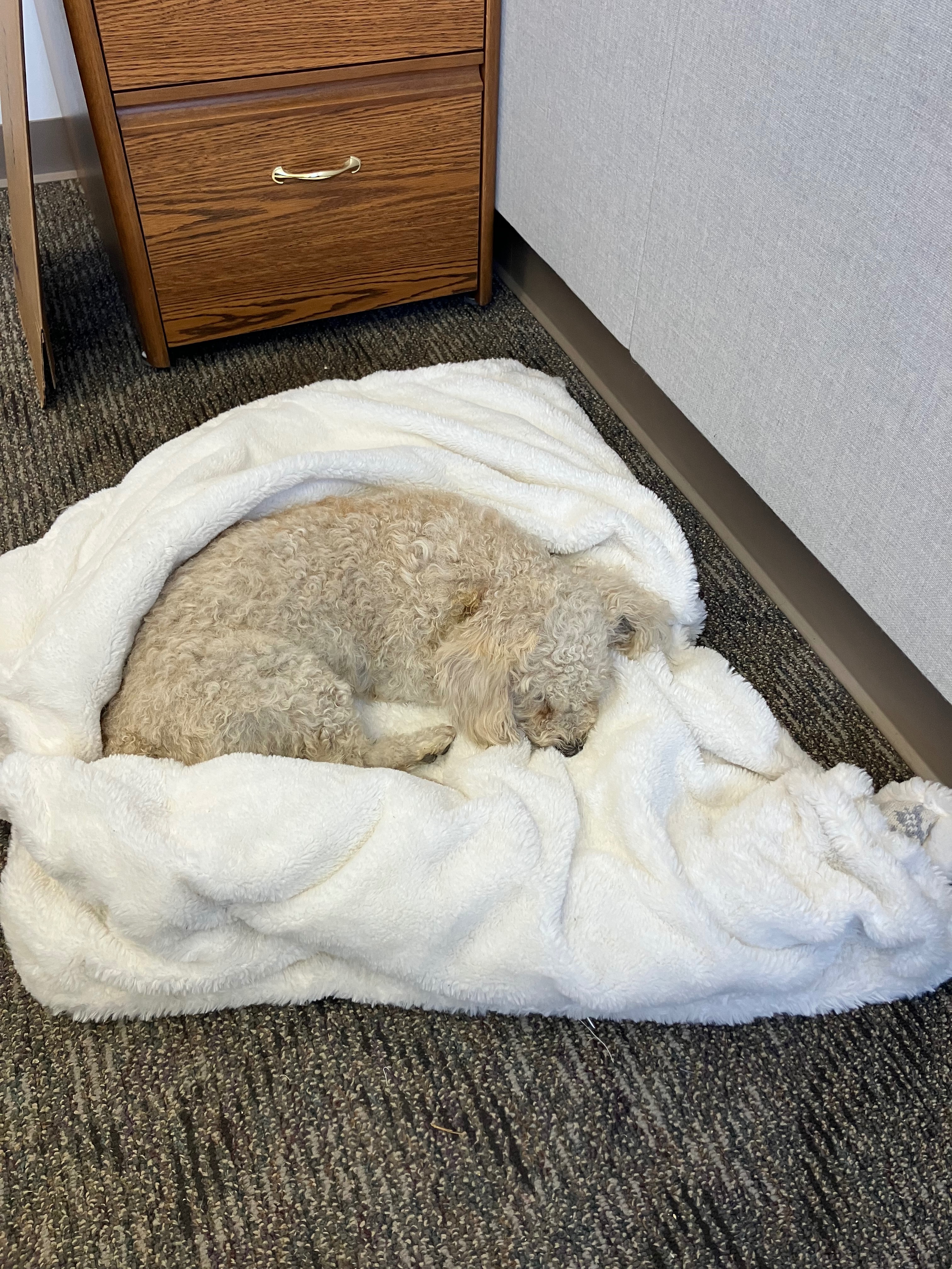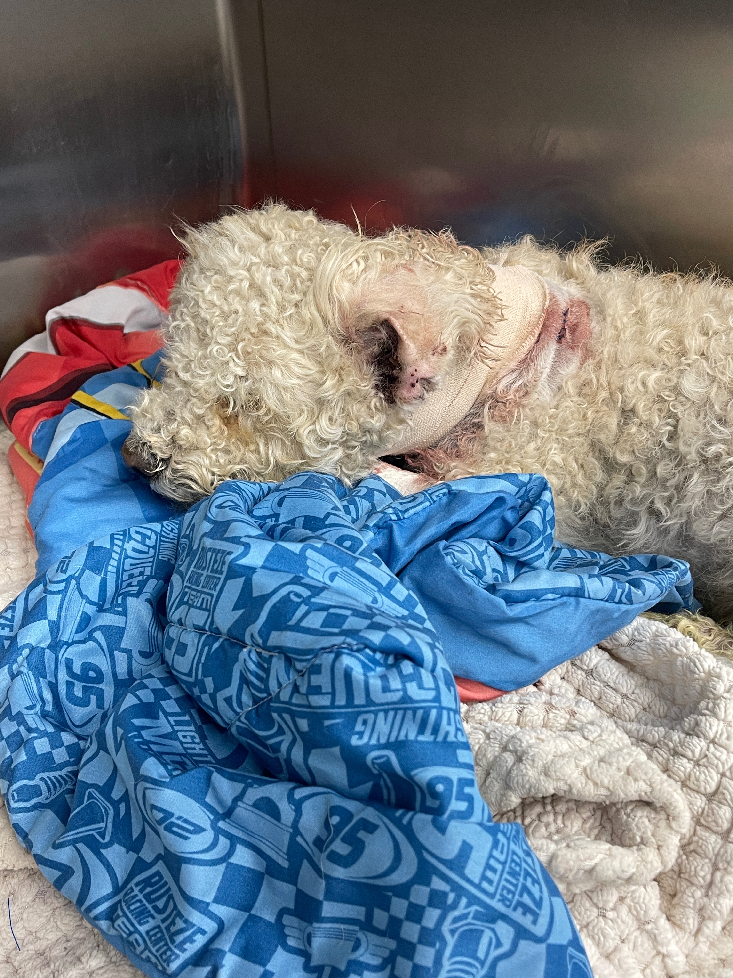 Today, I picked a white poodle off the middle of the street in the desert where I work (dogs are dumped a lot there). I thought he was dead. He had been attacked and had several puncture wounds, the worst to his neck. By the look of him, he had been outside a long time; it is incredible he survived. I took him to the vet, and he has a damaged trachea. They are stabilizing him tonight, and he is having surgery in the morning to fix it. I paid in advance because he was in awful pain, and the neck puncture began to bleed a lot due to the fluid build-up in his trachea. He couldn't eat and had raspy breath. The bills are very large, and I honestly cannot afford them, but I couldn't let this guy die. He is only 5 years old and deserves to live. Thank you so much.