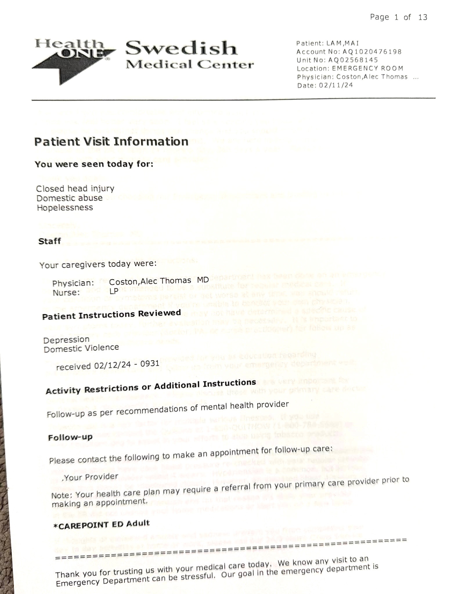 Trong suốt bốn năm rưỡi qua, tôi đã chăm sóc hai con ngày đêm, vì trẻ tự kỷ thường thức suốt đêm, và có nhiều ngày tôi hoàn toàn không ngủ. Chồng cũ của tôi không hề giúp tôi chăm sóc các con, và ban ngày anh ta gần như không bao giờ ở nhà. Anh ta nghiện rượu và trở nên cực kỳ bạo lực khi say. Anh ta đã đánh tôi nhiều lần, phá nát nhà cửa và ném đồ đạc xung quanh. Tôi đã gọi 911 bốn lần, và cuối cùng cảnh sát đã bắt giữ anh ta, nhưng tôi đã không truy tố. Vì vậy, văn phòng công tố không tiến hành truy tố vụ việc. Tuy nhiên, cảnh sát đã giúp tôi xin được lệnh bảo vệ và buộc anh ta rời khỏi nhà. Hiện tại, tôi vẫn đang sống trong căn nhà đó và chăm sóc hai con.